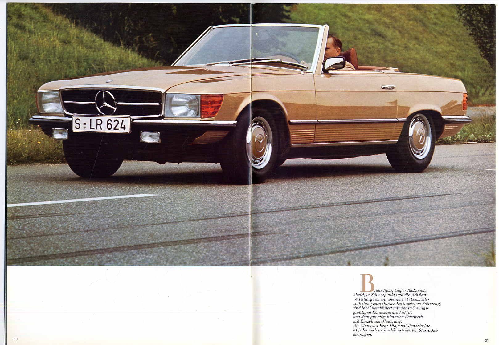 350 SL Mercedes Benz. Stuttgart, 1971. Ca. 29,5 x 21 cm. 27 Seiten. Mit zahlreichen farbigen Abbildungen. Farbig illustr. Orig.-Broschur. Autoprospekt in deutscher Sprache. Gutes Exemplar.