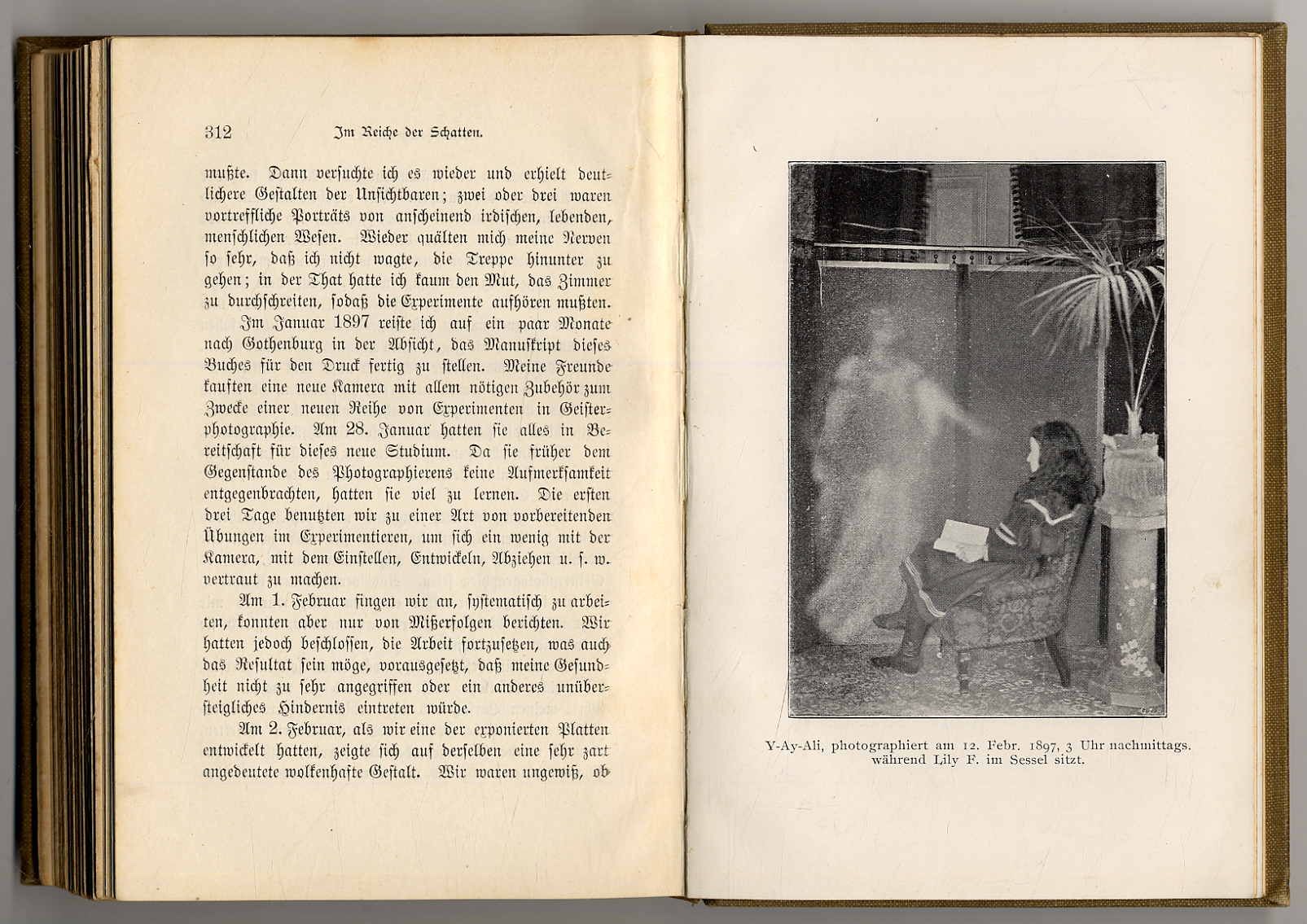 Espérance, E[lizabeth] de (d.i. Elizabeth Hope): Im Reiche der Schatten, Licht aus dem Jenseits. Einleitung von a. Aksakof. Berlin, Karl Siegismund, [1901]. Ca. 18,5 x 12,5 cm. XVI S., 330 S., (6) Seiten. Mit 28 Abbildungen auf Tafeln. Orig.-Leinenband. Erste deutsche Ausgabe. Autorisierte Übersetzung aus dem Englischen. Zwei Blätter am Falz verstärkt, einige Seiten leicht fleckig.