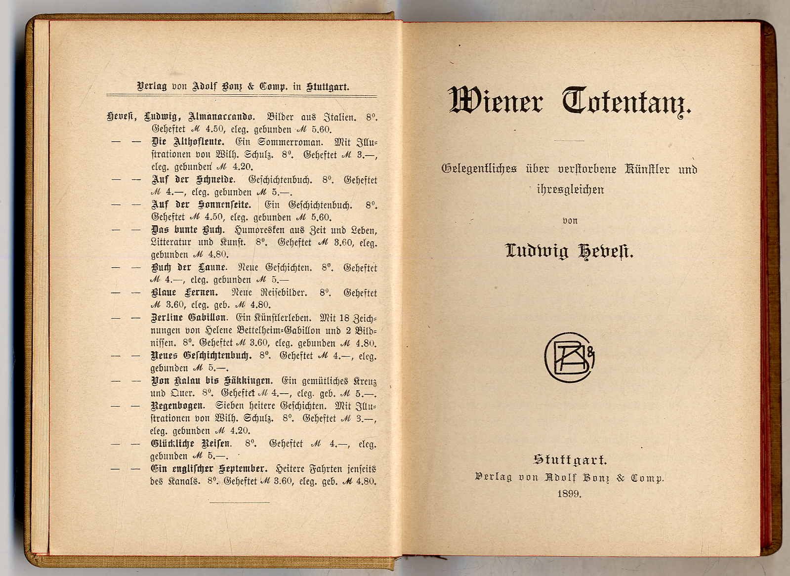Hevesi, Ludwig: Wiener Totentanz. Gelegentliches über verstorbene Künstler und ihresgleichen. Stuttgart, Adolf Bonz & Comp., 1899. Ca. 16,5 x 12 cm. VIII S., 394 S., (2) Seiten. Illustr. Orig.-Leinenband. Aus dem Inhalt u.a.: Charlotte Wolter, Helene Hartmann, amalie Holzinger, Fany Elßner, Ludwig Arnsburg, Hans Makart, Hans Canon, Emil J. Schindler, Viktor Tilgner, Heinrich Natter, Rubinstein, Robert Volkmann, Heinrich Laube, Ferdinand Kürnberger. Vorsätze etwas fleckig. Hübscher Einband.