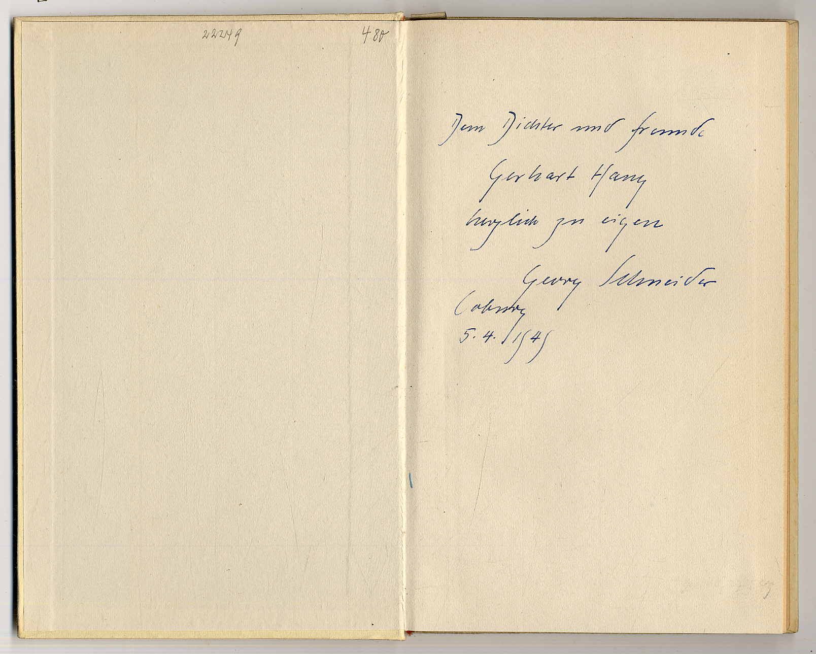 Corbiére, Tristan: Die gelben Liebschaften. Französisch, mit deutschen Nachdichtungen von Georg Schneider. Hamburg., Heinrich Ellermann, 1948. Ca. 20,5 x 13 cm. 109 S., (3) Seiten. Orig.-Pappband. Mit handschriftlicher Widmung von Georg Schneider (1902-1972, Schriftsteller, Rektor und Politiker). Rücken minimal bestoßen, Seiten papierbedingt leicht gebräunt. Gutes Exemplar.