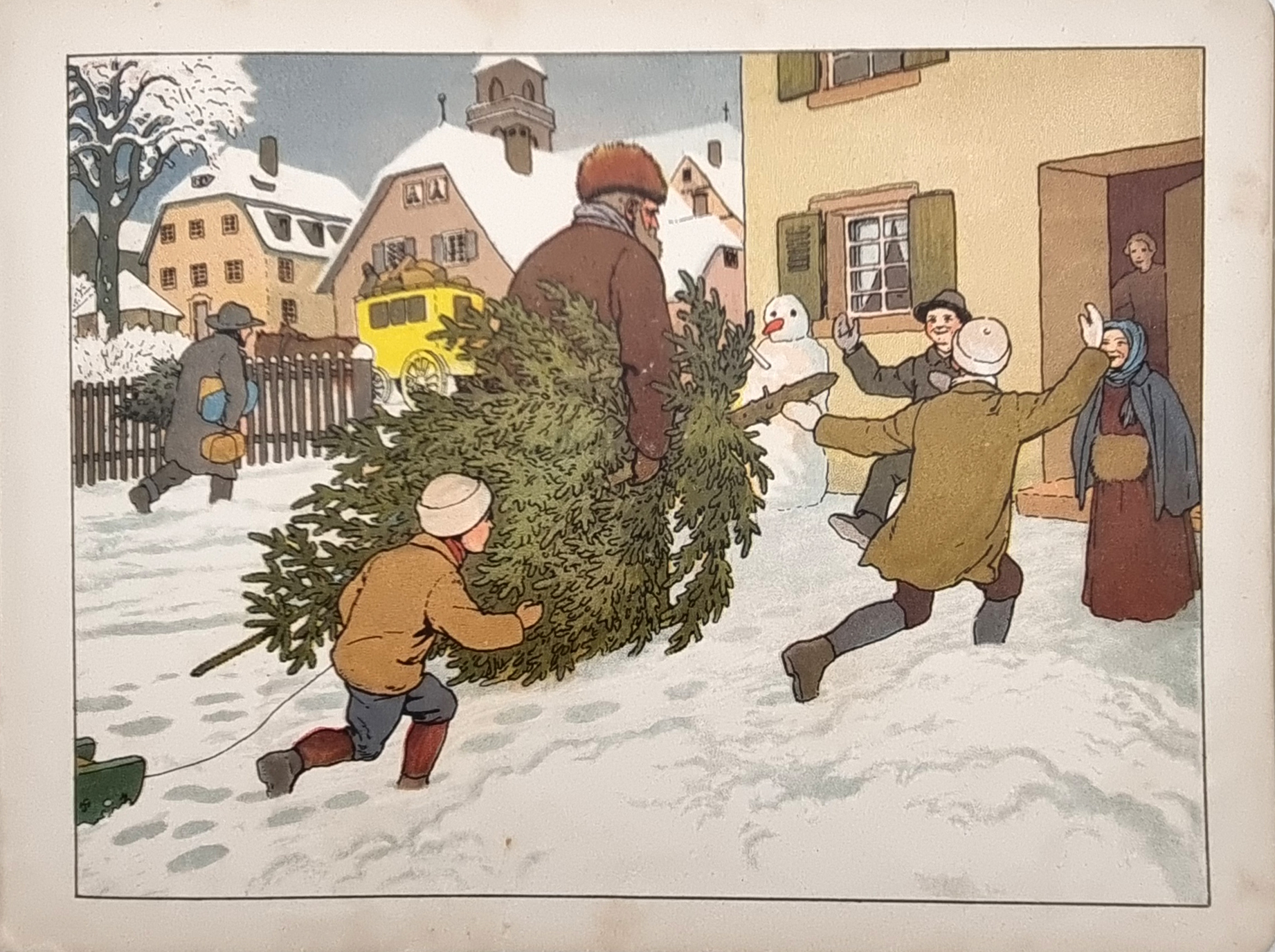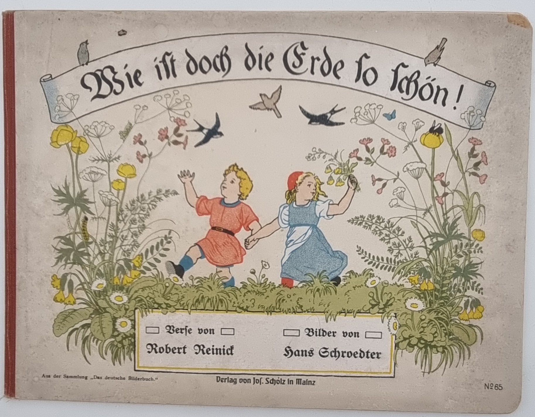 Reinick, Robert: Wie ist doch die Erde so schön! Mainz, Jos. Scholz, [1925]. Querformat, ca. 21,5 x 29 cm. (16) Seiten. Mit farbigen Bildern (davon 6 ganzseitigen) von Hans Schroedter. Farbig illustr. Orig.-Halbleinenband. Aus der Reihe: Scholz’ Künstler-Bilderbüch (Das Deutsche Bilderbuch). Deckelinnenseiten mit jeweils vier tanzenden Zwergen illustriert. Buchblock etwas gelockert, Einbandkanten teils bestoßen, Seiten leicht fingerfleckig. Kinderverse mit hübschen Illustrationen.