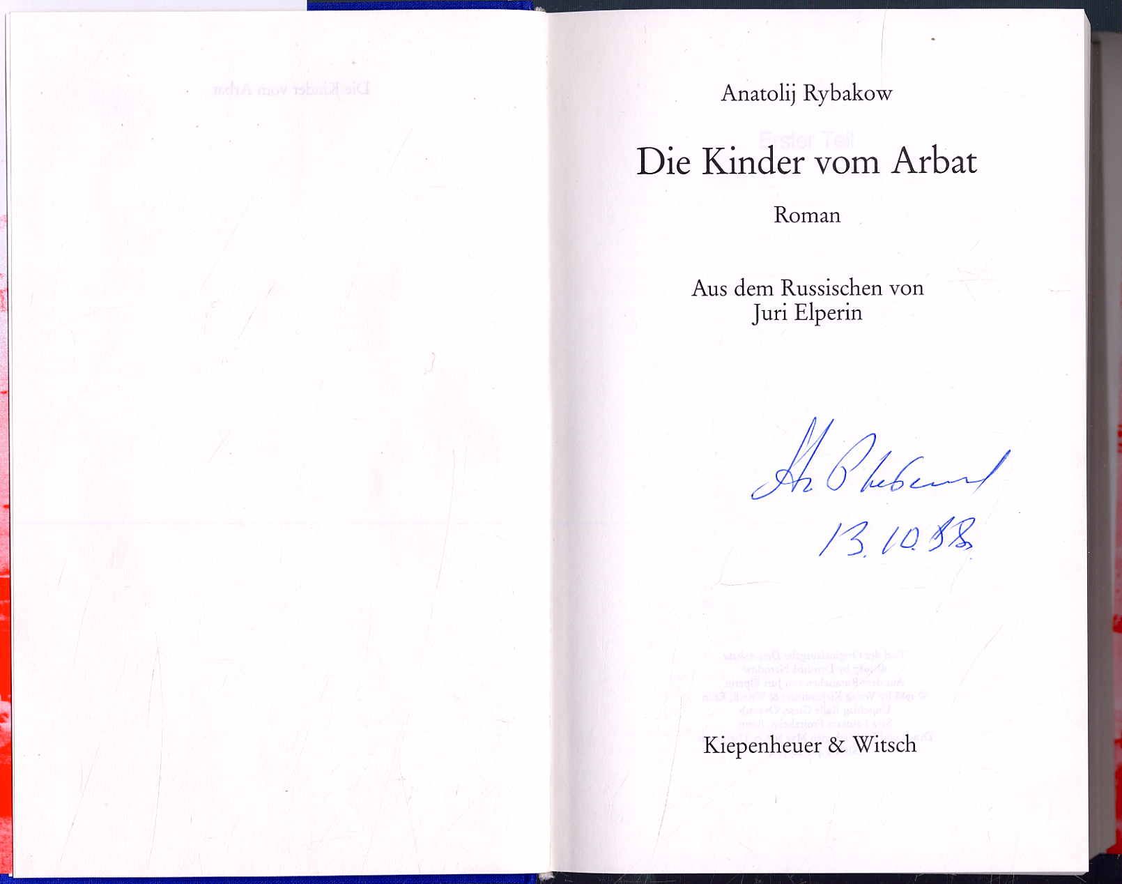 Rybakow, Anatolij: Die Kinder vom Arbat. Aus dem Russischen von Juri Elperin. Köln, Kiepenheuer und Witsch, 1988. Ca. 22 x 14 cm. 759 S., (6) Seiten. Blauer Orig.-Leinenband mit Schutzumschlag. Erste deutsche Ausgabe, vom Autor auf dem Titel signiert und datiert.