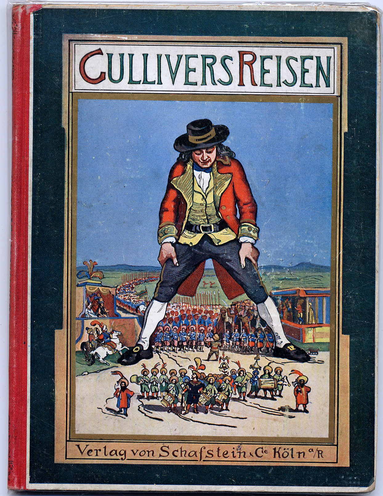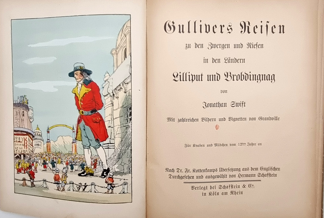 Swift, Jonathan: Gullivers Reisen zu den Zwergen und Riesen in den Ländern Lilliput und Brobdingnag. Für Knaben und Mädchen vom 12ten Jahre an. Nach Dr. Fr. Kottenkamps Übersetzung aus dem Englischen. Durchgesehen und ausgewählt von Hermann Schafstein. Köln, Schafstein & Cie., [1904]. Ca. 25 x 19 cm. (6) S., 101 S., (5) Seiten. Mit 3 Farbendruckbildern und zahlreichen Bildern und Vignetten von Grandville. Farbig illustr. Orig.-Halbleinenband. Klotz 7243/111. Einband etwas bestoßen, aufmontiertes Bild im unbedruckten Rand mit Fehlstellen. Seiten leicht gebräunt, jedoch gutes Exemplar