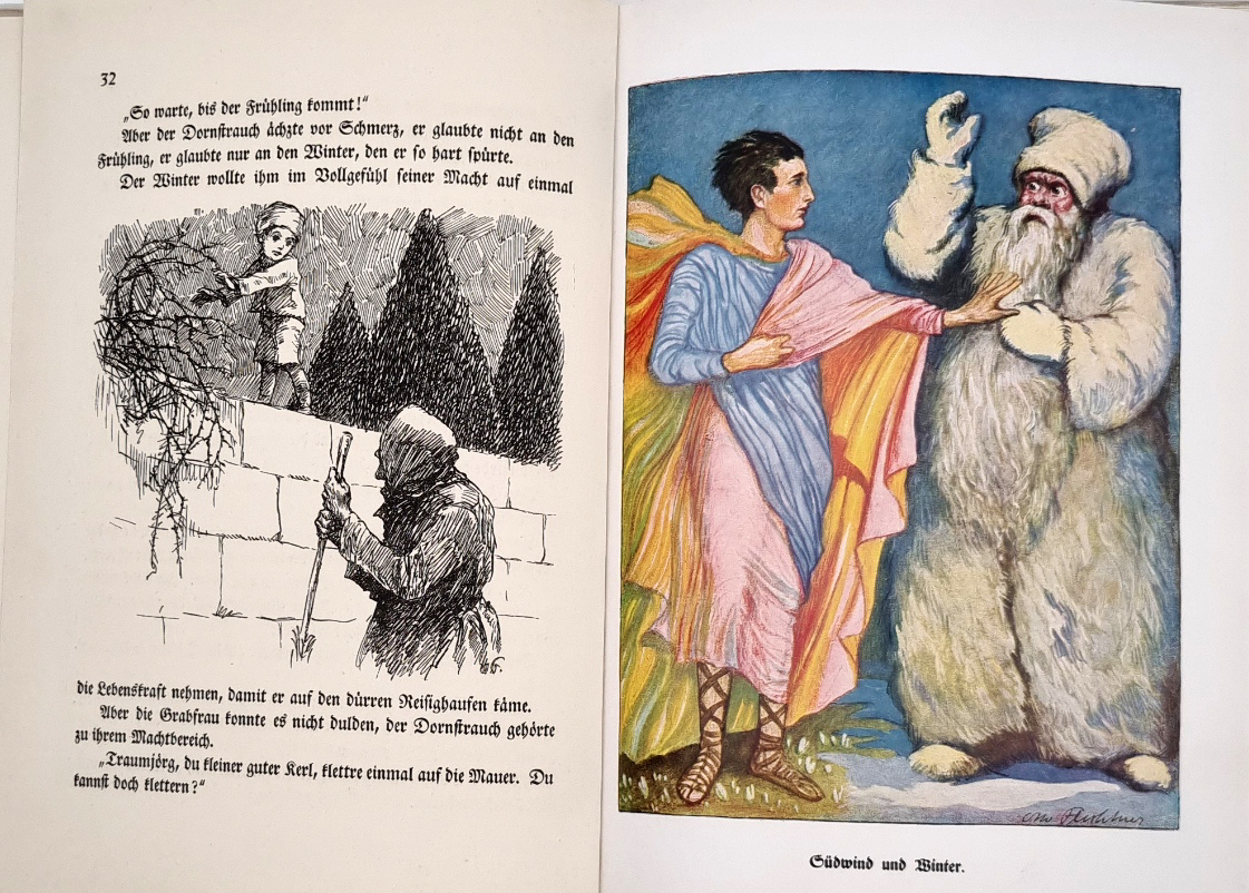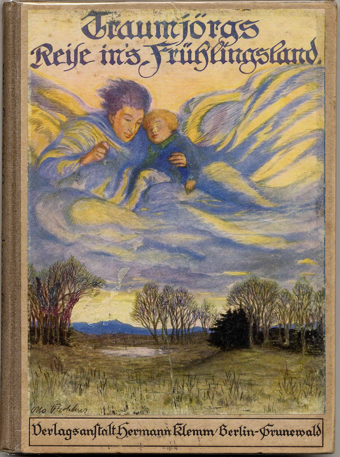 Hartwig, Paul Hermann: Traumjörgs Reise ins Frühlingsland. Ein deutsches Märchen. Berlin-Grunewald, Verlagsanstalt für Litteratur und Kunst H. Klemm, [1919]. Ca. 21,5 x 20 cm. 118 S., (2) Seiten. Mit zahlreichen, teils farbigen ganzseitigen, Illustrationen von Otto Flechtner. Farbig illustr. Orig.-Halbleinenband. Einband etwas berieben und etwas fleckig. Klammerung leicht angerostet. Aus dem Inhalt u.a.: Traumjörg und Muhme Lene; Bei der Grabfrau; In der Werkstatt des Frühlings; Das Wasser des Lebens; Ostersegen.