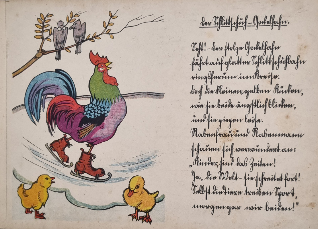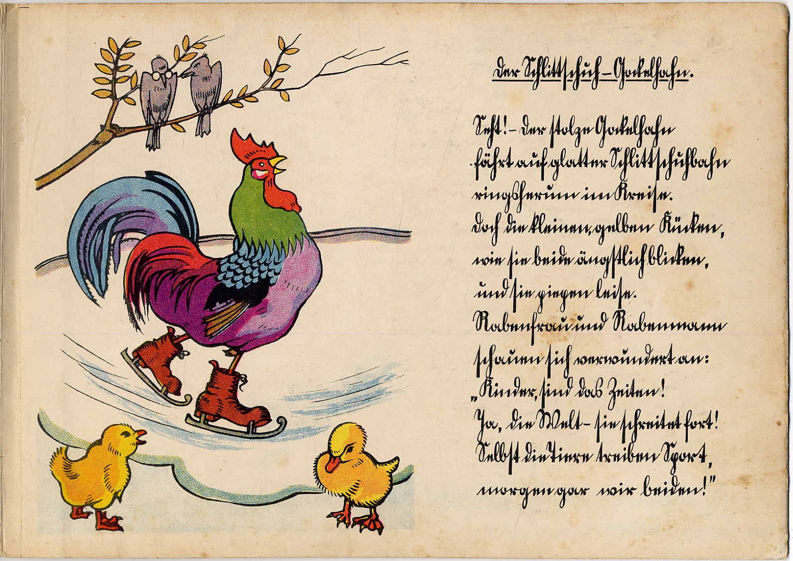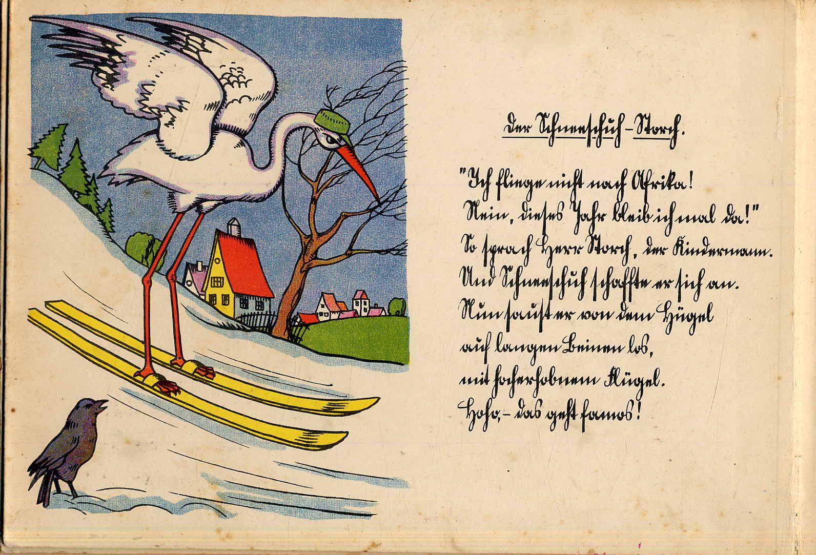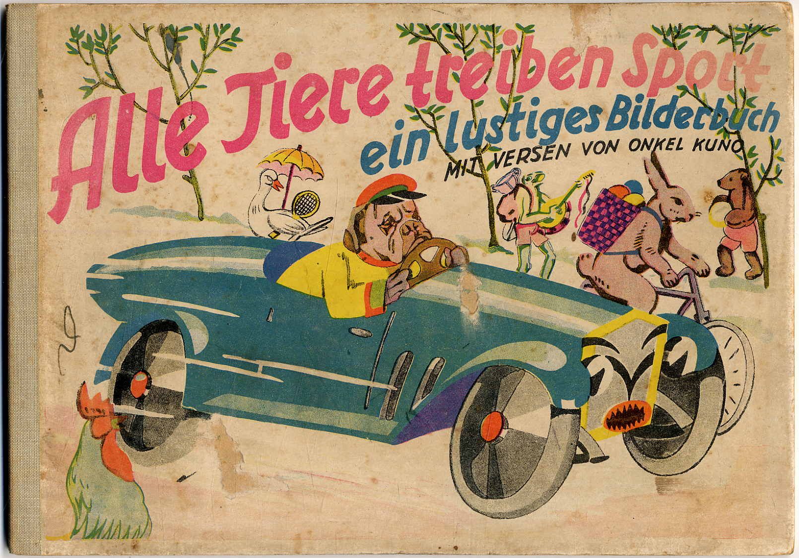 Onkel Kuno: Alle Tiere treiben Sport ein lustiges Bilderbuch. Mit Versen. Fürth, Jos. Hesse, o.J., Querformat, ca. 19 x 27 cm. 4 feste Pappblätter (incl. Einband) mit farbigen Illustrationen. Farbig illustr. Orig.-Halbleinenband. „Unzerreißbares“ Bilderbuch auf fester Pappe. Einband mit kleineren Abriebstellen und berieben. Rückseits mit Stempel „Die bewährte Wäschemarke BOHU …“. Text in Sütterlin. Die Tiere treiben Sport: Hasenradfahrer, Wanderfrosch, Fußball-Teddys, Tennis-Gänschen, Schneeschuh-Storch (mit Ski), Schlittschuh-Gockelhahn. Sehr seltenes Bilderbuch mit vermenschlichten Tieren, wohl als Werbegeschenk für die Kaufhäuser produziert.