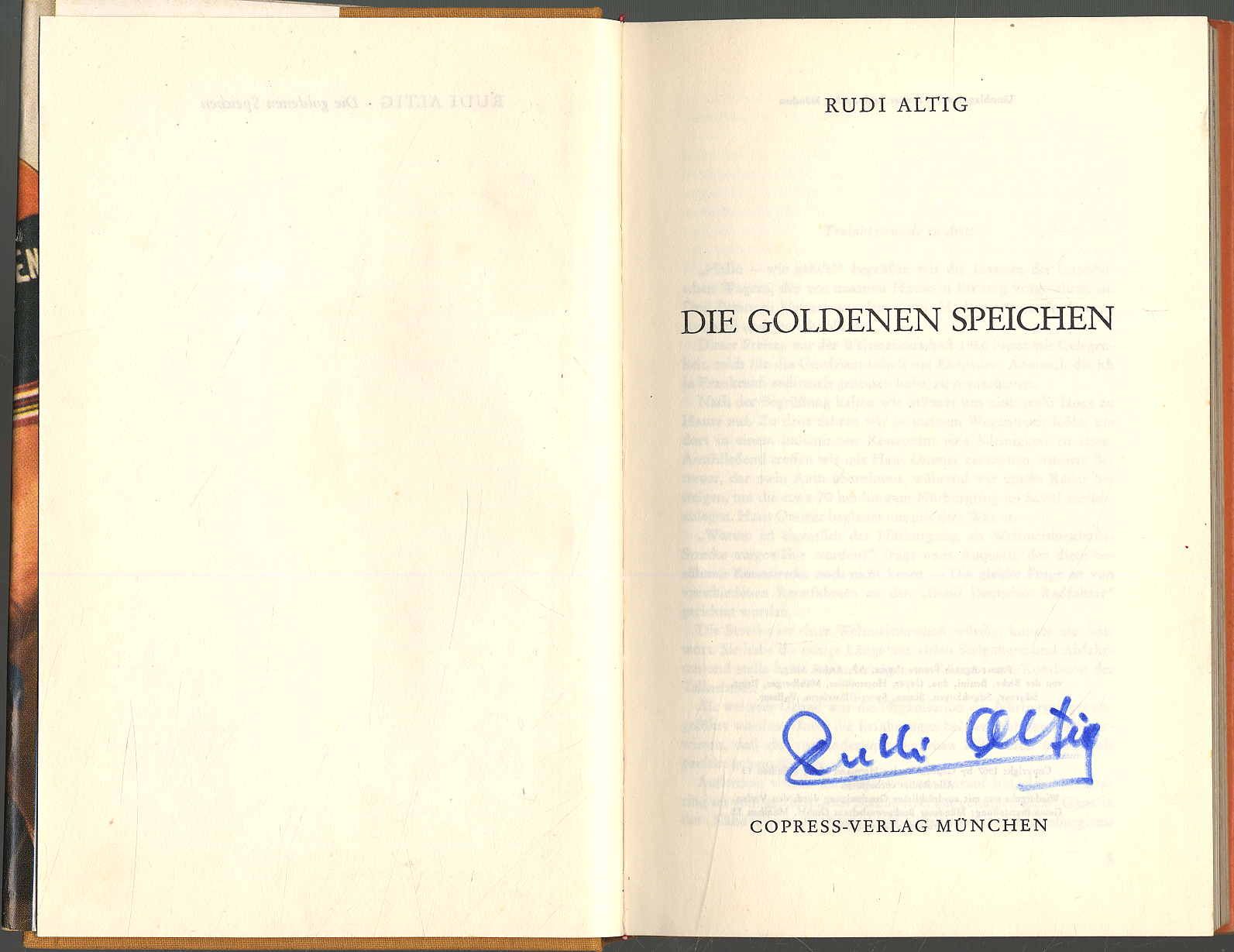 Altig, Rudi: Die goldenen Speichen. München, Copress Verlag, 1967. Ca. 20 x 13 cm. 222 S., (2) Seiten. Mit zahlreichen Abbildungen. Orig.-Leinenband mit Schutzumschlag. Auf dem Titelblatt mit eigenhändiger Signatur von Rudi Altig (1937-2016, Radrennfahrer). Leicht stockfleckig, jedoch gutes Exemplar.