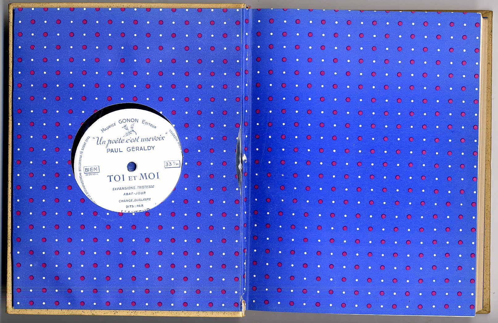Géraldy, Paul: Toi et Moi. Frontispice de Dignimont. [Paris], Maurice Gonon, 1957. Ca. 24,5 x 18,5 cm. 155 S., (8) Seiten. Mit 1 Schallplatte, farbigen Vorsätzen, 1 farbigem Frontispiz und zahlreichen vignetten von G. Aufschneider. Farbig illustr. Orig.-Pappband nach einem Entwurf von Paul Bonet. Ex. Nr. 71/3100 auf Grand Velin, mit dem bisher unveröffentlichen Gedicht „Absence“. Rücken am Falz aufgeplatzt, jedoch dekorativer Einband. Namenszug auf erstem unbedrucktem Blatt. Auf der beiliegenden Schallplatte rezitiert Géraldy erstmals die in der Ausgabe abgedruckten Gedichte. Sehr gutes Exemplar.