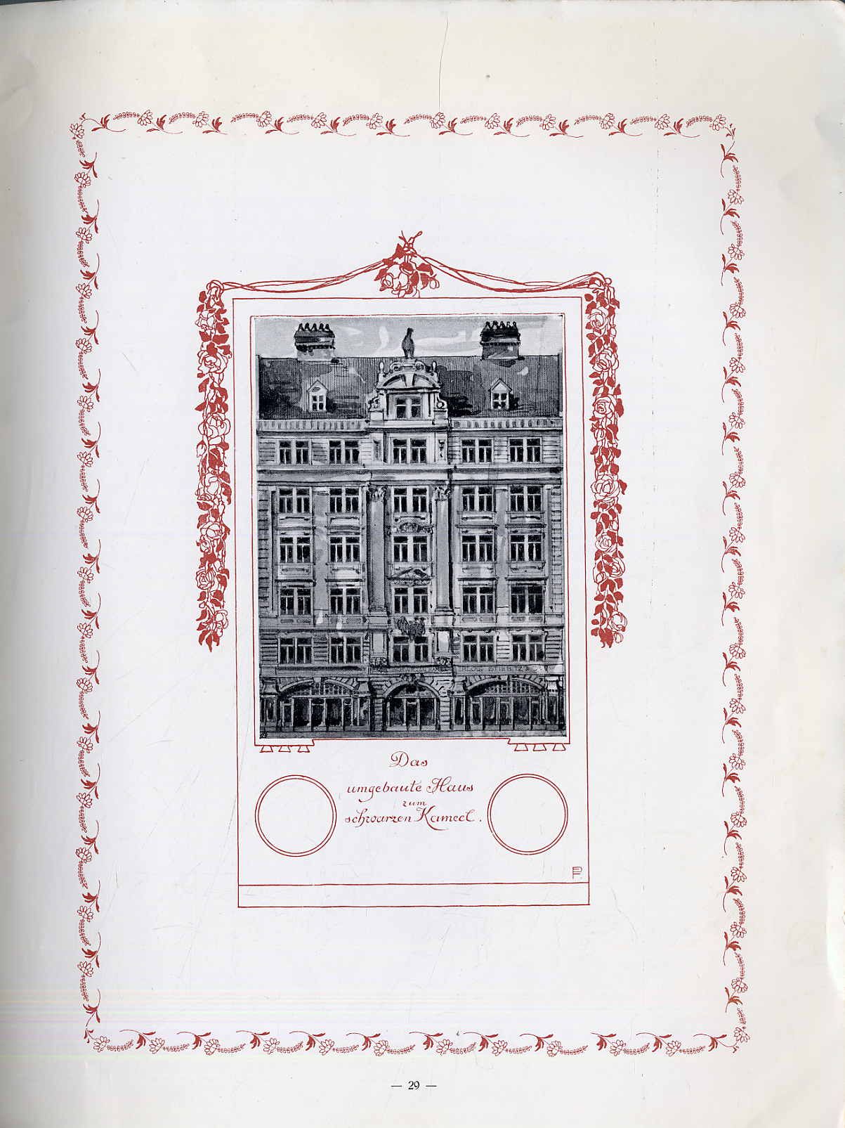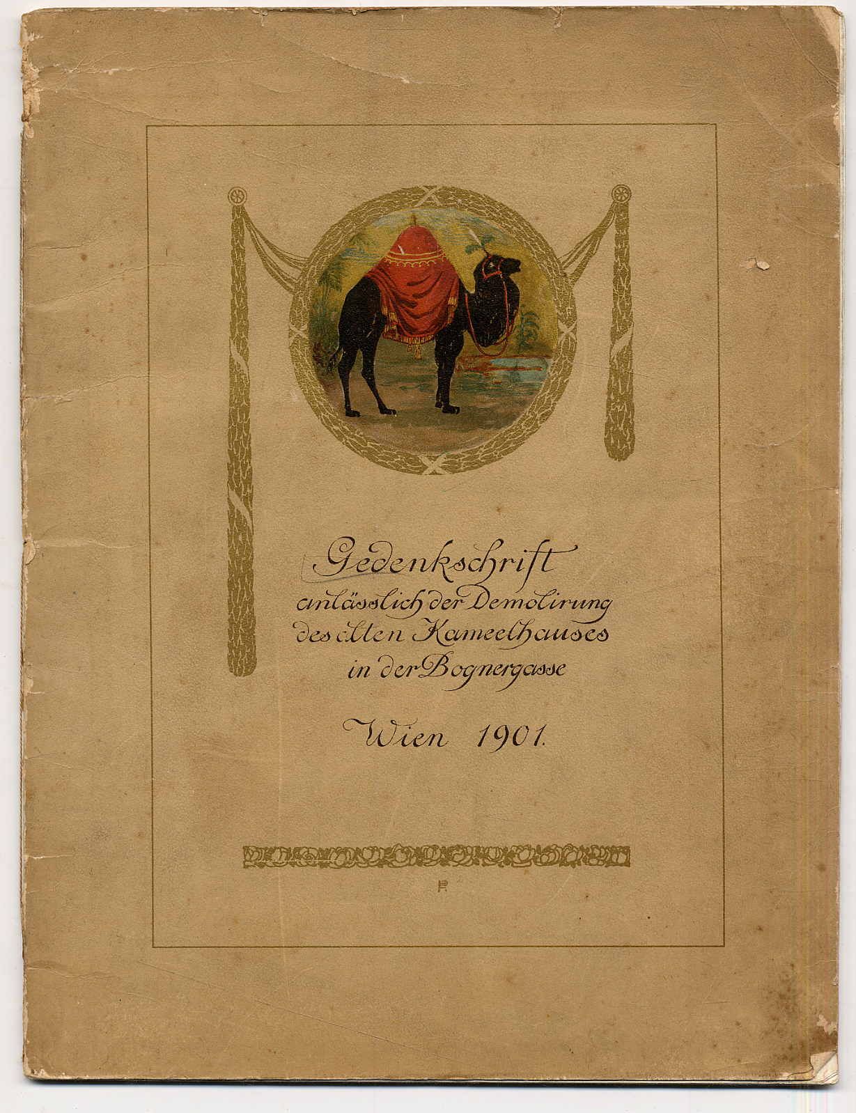 [Stiebitz, Franz Joseph]: Gedenkschrift anlässlich der Demolirung des alten Kameelhauses in der Bognergasse Wien 1901. Wien, Franz J. Stiebitz, 1901. Ca. 30 x 23 cm. 31 Seiten. Mit Buchschmuck von Ferd. Pamberger und Abbildungen. Farbig illustrierter Orig.-Karton. „Im Jahr 1618 erwarb Johan Baptist Cameel das schon damals traditionsreiche Haus in der Bognergasse 5 in der Wiener Innenstadt, errichtete eine Gewürzkrämerei und nannte das Geschäft in Anspielung auf seinen Nachnamen „Zum Schwarzen Kameel“. Zwei Jahrhunderte später übernahm ein gewisser Joseph Stiebitz das Reich der edlen Weine und duftenden Spezereien, erweiterte den Laden zu einer erlesenen Feinkosthandlung und avancierte 1825 zum Hoflieferanten.“ (Schwarzeskameel.at – unsere Geschichte). Hier die vom Eigentümer Stiebitz verfasste und verlegte Gedenkschrift, mit dem zweiseitigen Faksimile des 1818 geschlossenen Kaufvertrags zwischen Jacob Prantl und Joseph Stiebitz. Einband fleckig und bestoßen, Seiten teils etwas fingerfleckig und leicht gewellt. Titelblatt eigenhändig von Henriette Stiebitz signiert.