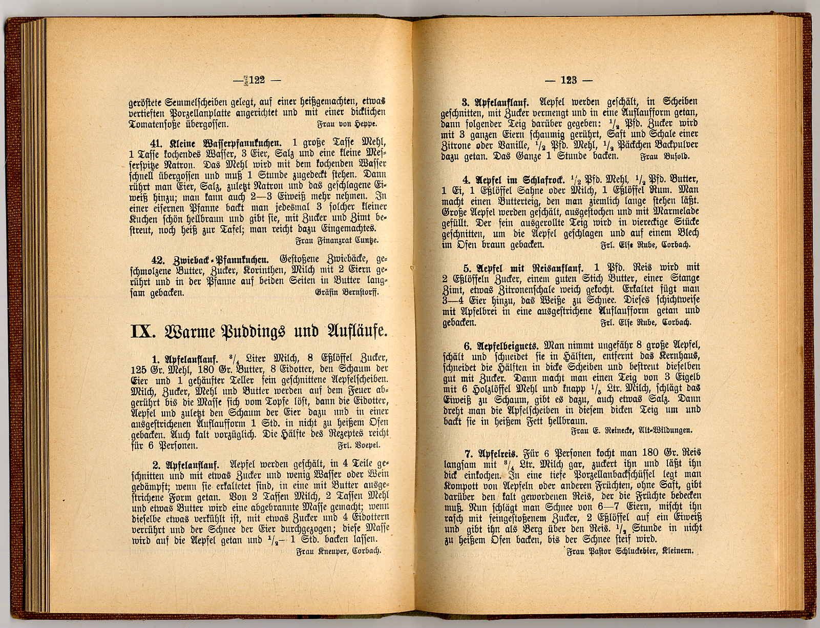 Walld. Landesfrauenverein: Waldecksches Kochbuch. 1000 erprobte Rezepte. 6. veränderte Auflage. Arolsen, Loewié, 1932. Ca. 21,5 x 13,5 cm. 226 Seiten. Orig.-Halbleinenband. Einband und Seiten teils etwas braunfleckig. „Pilzkoteletts: Auf 1 gehäuften Suppenteller gereinigte Champignons, fein gehackt, 1/2 Pfd. gewiegtes Schweinefleisch, geriebene Zwiebel, Salz, Pfeffer, sowie geriebenes Weißbrot wie nötig, um Koteletts formen zu können. In Butter oder Bratfett gebrachten. – Frl. A. Waldeck, Corbach“.