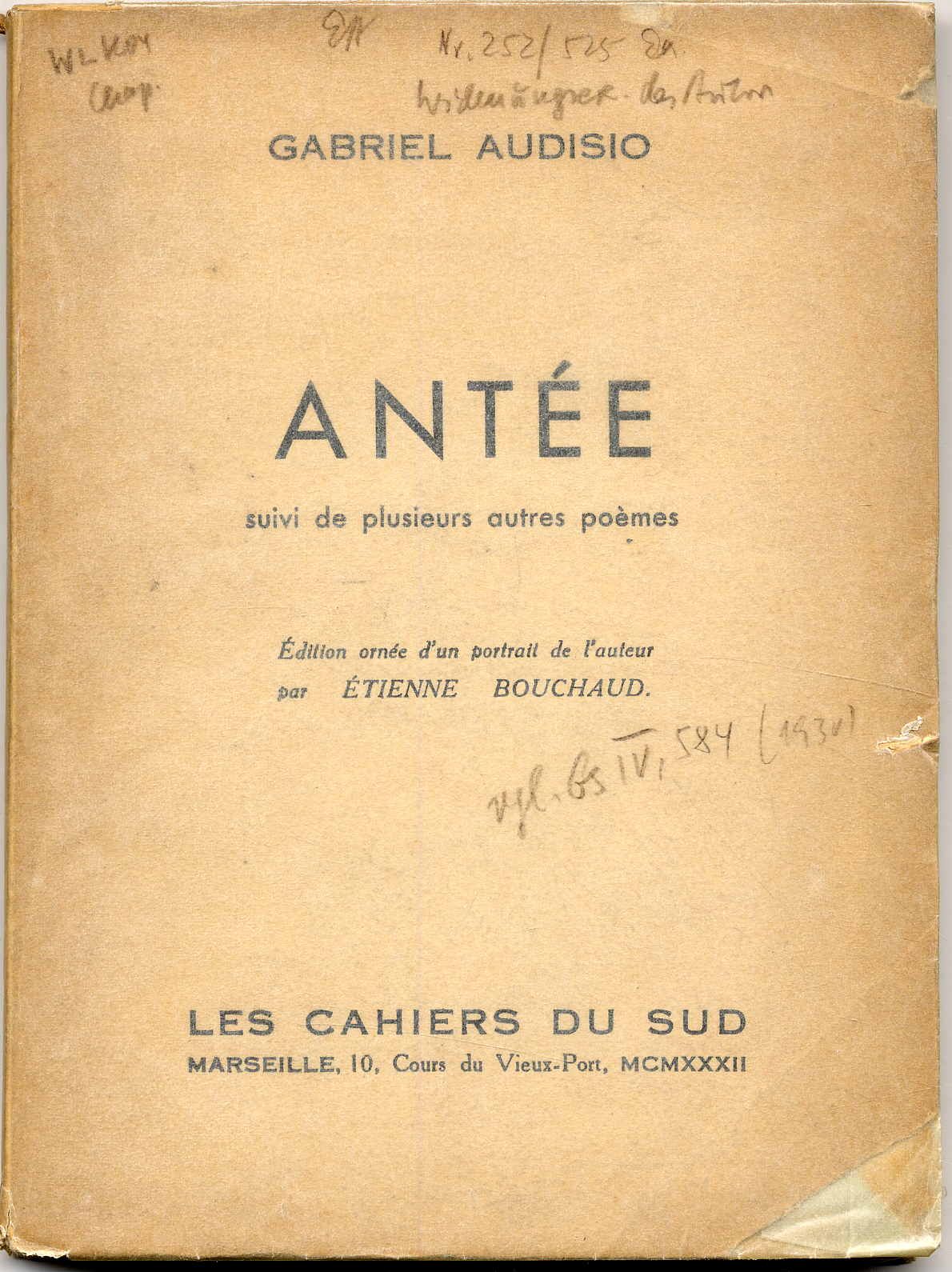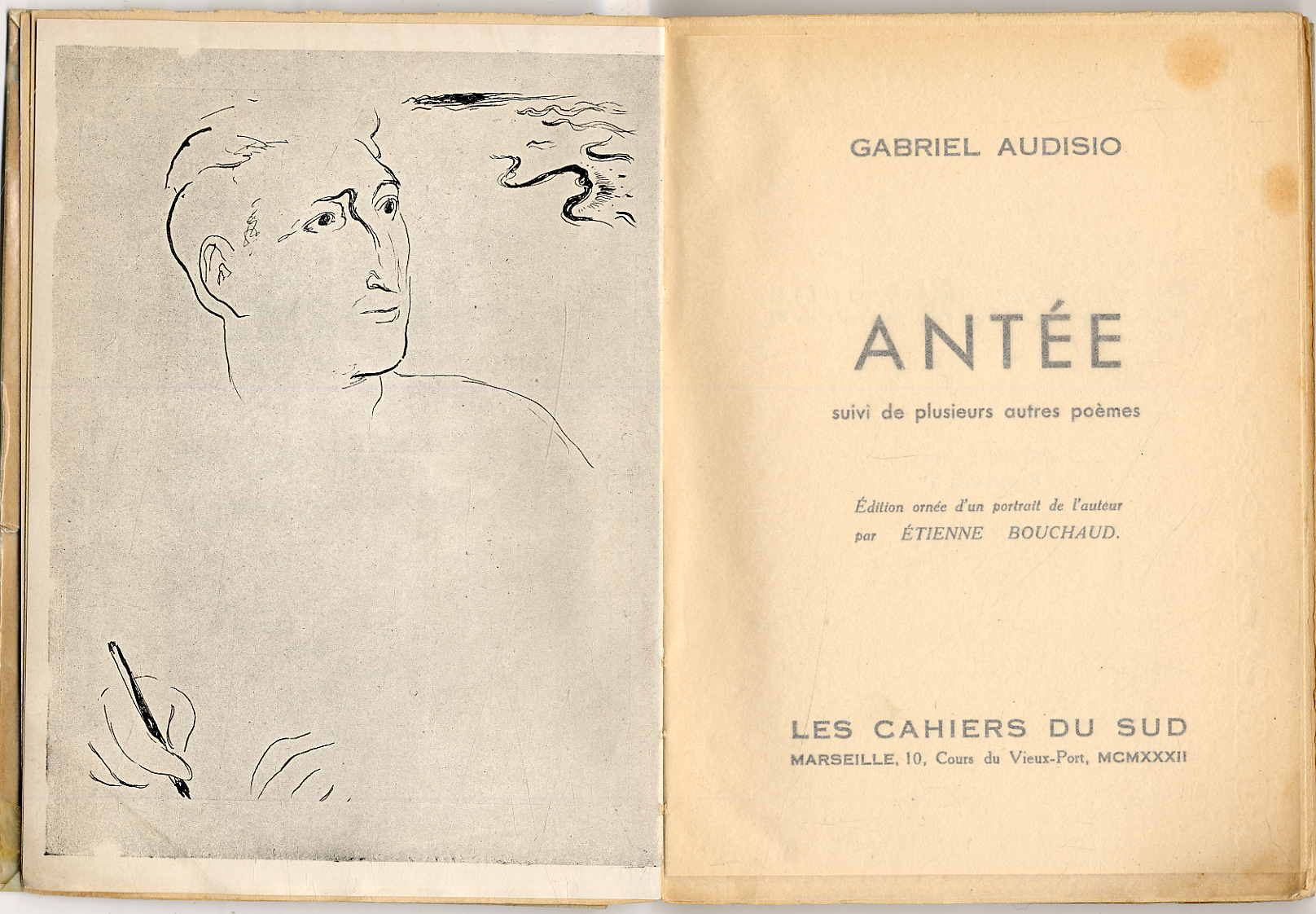 Audisio, Gabriel: Antée suivi de plusieurs autres poèmes. Èdition ornée d’un portrait de l’auteur par Éienne Bouchaud. Maresille, Les Cahiers du Sud, 1932. Ca. 19 x 14 cm. 89 S., (6) Seiten. Mit einer Abbildunge. Orig.-Broschur.