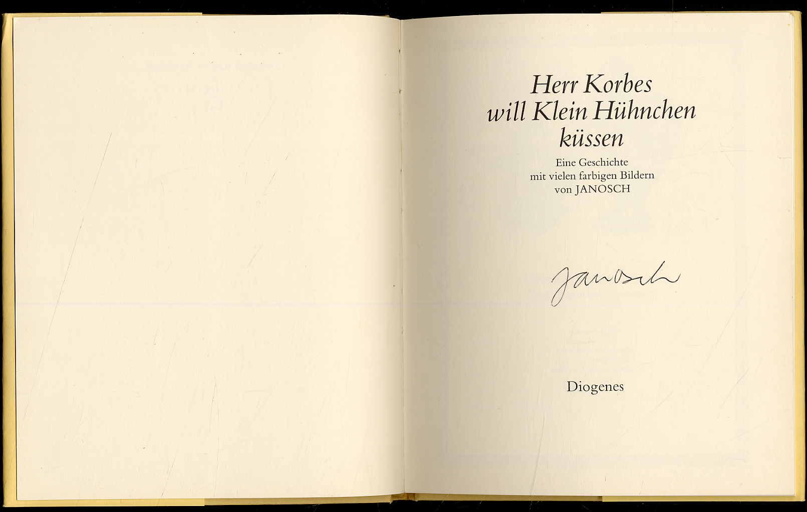 Janosch (d.i. Horst Eckert): Herr Korbes will Klein Hühnchen küssen. Eine Geschichte mit vielen farbigen Bildern. Zürich, Diogenes, 1984. Ca. 19 x 16 cm. (32) Seiten mit farbigen Zeichnungen von Janosch. Farbig illustr. Orig.-Pappband mit Schutzumschlag. Erste Ausgabe. Auf dem Titelblatt von Janosch eigenhändig signiert (die Signatur auf dem Innendeckel ist dagegen gedruckt).