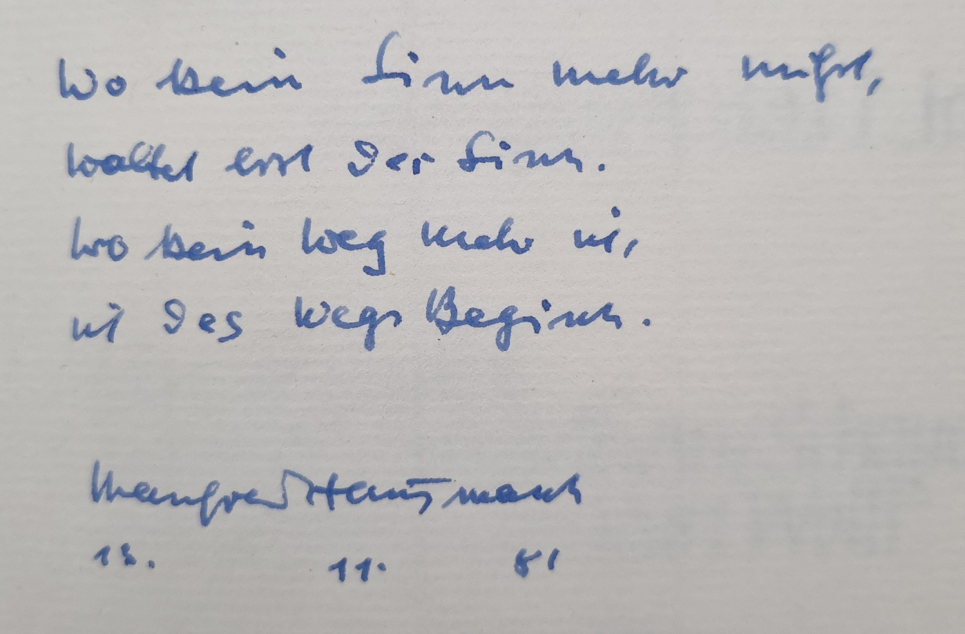 Hausmann, Manfred: So beginnt das Licht. Eine Auswahl besorgt von Karlheinz Schauder, geschrieben von Kurt Wolff. 4. Auflage. Neukirchen, Edition Emil Müller, 1981. Ca. 14,5 x 13,5 cm. 47 Seiten. Orig.-Pappband. Vorsatz mit vierzeiligem handschriftlichen Sinnspruch und eigenhändiger Unterschrift von Manfred Hausmann (1898-1986, Schriftsteller), datiert 13.11.81.