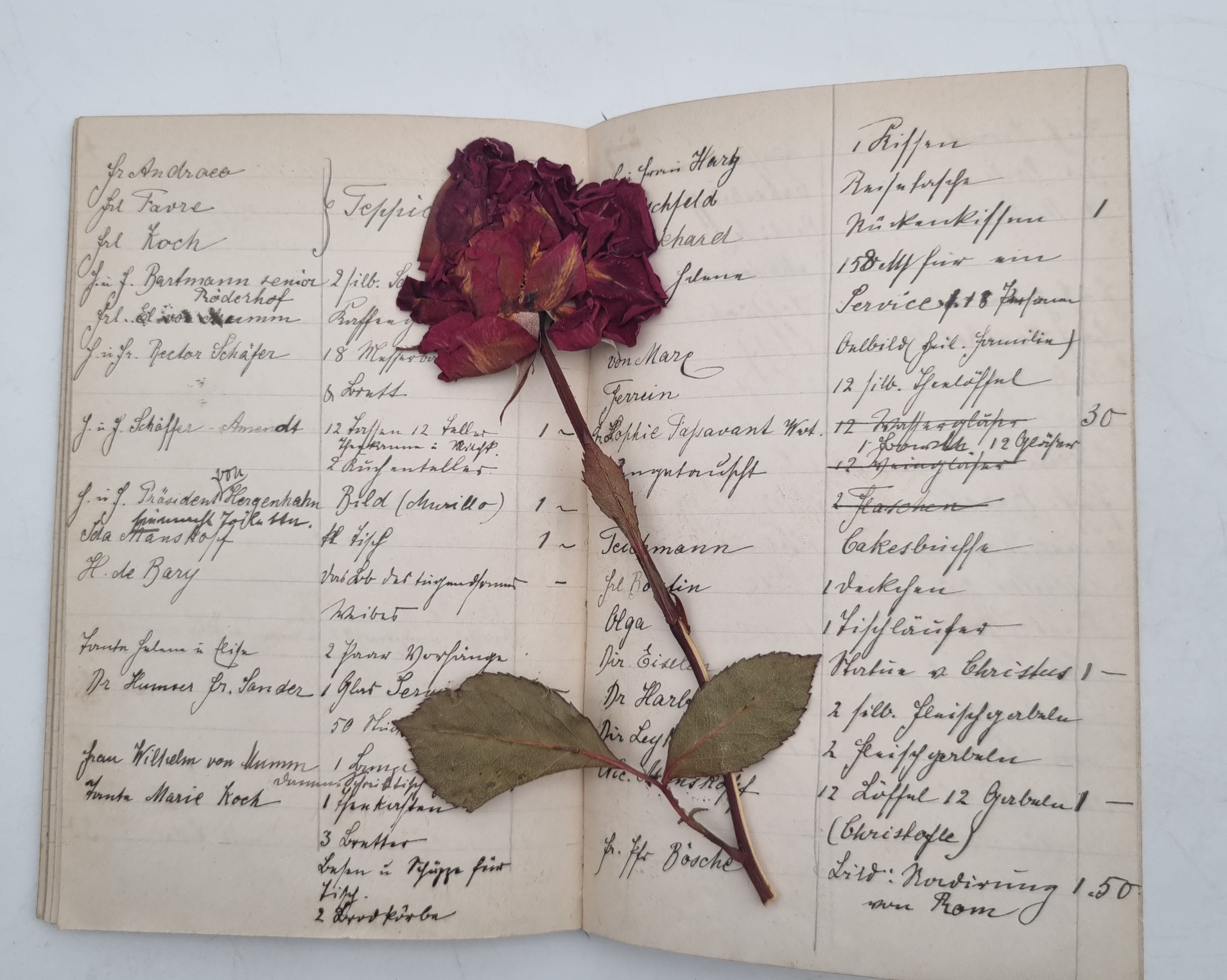 Ehlers, Anna (verh. Börsch): Ausstattung 1891. Deutsche Handschrift auf Papier. Ohne Ort [Hamburg], 1891. Ca. 15,5 x 10,5 cm. 29 beschriftete Seiten und einige leere. Halbleinenband der Zeit. Verzeichnis der Aussteuergegenstände und der Hochzeitsgeschenke. Anna Ehlers (1863-1932) heiratete 1891 den Pfarrer in Eschersheim Eugen Börsch (1859-1934). Anna Börsch korrespondierte wie ihr Sohn Rudolf mit Else Lasker-Schüler, ihre Tochter Lili wurde Kinderbuchautorin. Verzeichnet Wäsche aller Art, Kücheneinrichtung, Möbel, Wochenbett- und Kinder-Ausstattung. Interessant ist auch das Verzeichnis der Hochzeitsgeschenke. Kulturhistorisch interessant.
