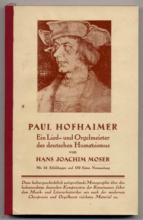 Hofhaimer – Moser, Hans Joachim: Paul Hofhaimer. 1 Stuttgart und Berlin, J. G. Cotta’sche Buchhandlung Nachf., 1929. Ca. 24,5 x 15,5 cm. (10) S., 216 S., (2) Seiten; 194 S., (2) Seiten. Mit 24 Abbildungen, zahlreichen Notenbeispielen und Hofhaimers Gesammelten Tonwerken als Anhang (193 Seiten Notenanhang). Neu aufgezogene Originalbroschur mit Leinenrücken. „Diese kulturgeschichtlich weitgreifende Monographie über den bedeutendsten deutschen Komponisten (1459-1537, österreichischer Komponist und Organist) der Renaissance führt dem Musik- und Literaturhistoriker wie auch der modernen Chorpraxis und Orgelkunst reichste Material zu.“ (Verlagstext).