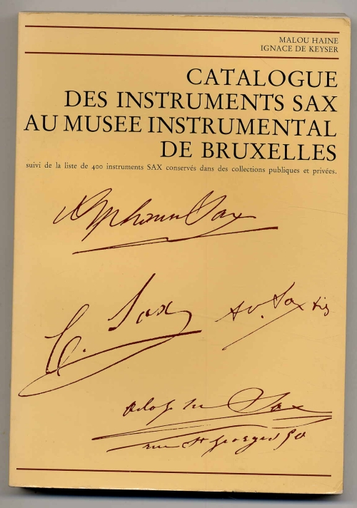 Haine, Malou und Ignace de Keyser: Catalogue des instruments sax au musée instrumental de Bruxelles suivi de la liste de 400 instruments Sax conservés dans des collections publiques et privées. Bruxelles, Musée instrumental, 1980. Ca. 25 x 17,5 cm. 279 Seiten. Mit ausfaltbaren Tafeln und zahlreichen Abbildungen. Farbig illustrierter Orig.-Karton. Aus der Reihe: Publications du Musée Instrumental de Bruxelles. Sehr gutes Exemplar. In französischer Sprache. „Les 69 instruments Sax du Musée instrumental de Bruxelles proviennent de sources diverses. Mis à part vingt-huit instruments achetés au vieux marché, en vente publique, chez un antiquaire ou à un particulier, le reste de la collection a été offet gracieusement au Musée. Dix-sept instruments, pour la plupart des instrument de la famille des bois, font partie de l’ancienne collection Snoeck comprenant 437 instruments acheté e donnés au Musée en 1907 par le mécène Louis Cavens (1850-1940). … Les instruments Sax de la collection ne sont pas uniquement d’Adolphe Sax, l’illustre inventeur du saxophone, mais ils portent la signature de trois autres membres de la famille Sax.“ (Introduction)