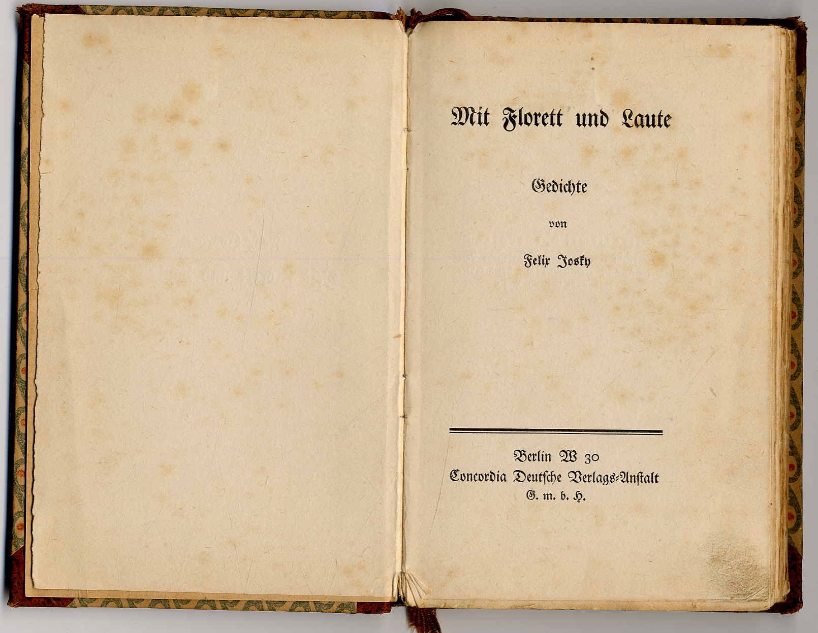 Josky, Felix: Mit Florett und Laute. Gedichte. Berlin, Concordia, 1909. Ca. 18 x 12 cm. 94 S., (2) Seiten. Halblederband der Zeit. Einband etwas berieben, Kanten bestoßen. Seiten stockfleckig, anfangs etwas fingerfleckig. Mit gedruckter Dedikation an Harry Walden (1875-1921, Schauspieler). Auf dem Dedikationsblatt ein Zeitungsausschnitt zur Beisetzung Harry Waldens mit Abklatsch der Büroklammerrostspuren auf vier Seiten. Erstausgabe des Erstlingswerks. Felix Josky (1870-1942, Schrifsteller) wurde 1942 in Theresienstadt ermordet.