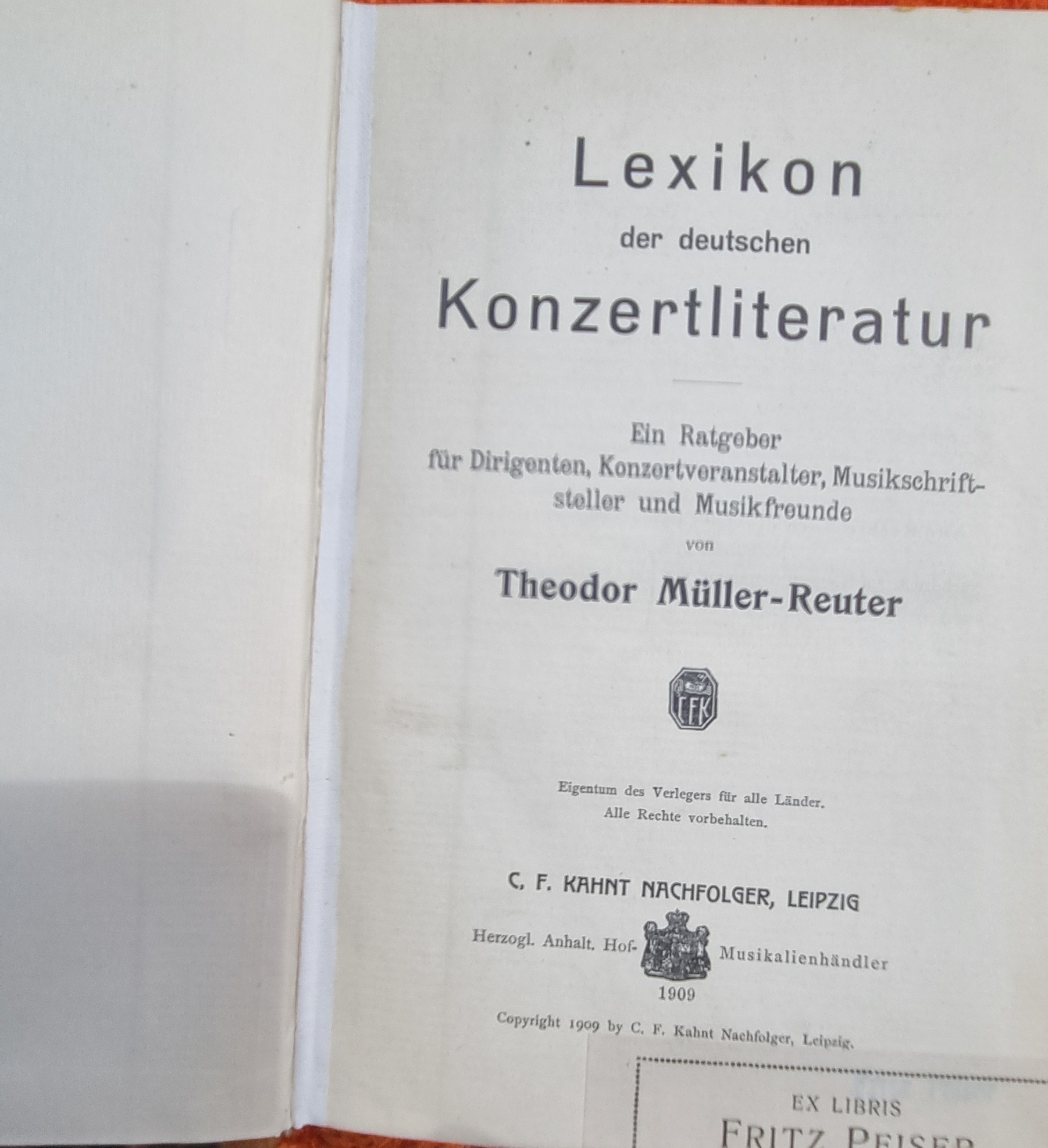 Müller-Reuter, Theodor: Lexikon der deutschen Konzertliteratur. + Nachtrag. Ein Ratgeber für Dirigenten, Konzertveranstalter, Musikschriftsteller und Musikfreunde. 2 Bände. Leipzig, C. F. Kahnt, 1909-1921. Ca. 22,5 x 15,5 cm. XXII S., 626 Seiten; VIII S., 238 S., (2) Seiten; Halbleinenbände der Zeit. Nachtragsband ohne Rückenschild und in diesem Band Seiten teils stockfleckig. Wichtige Bibliographie.