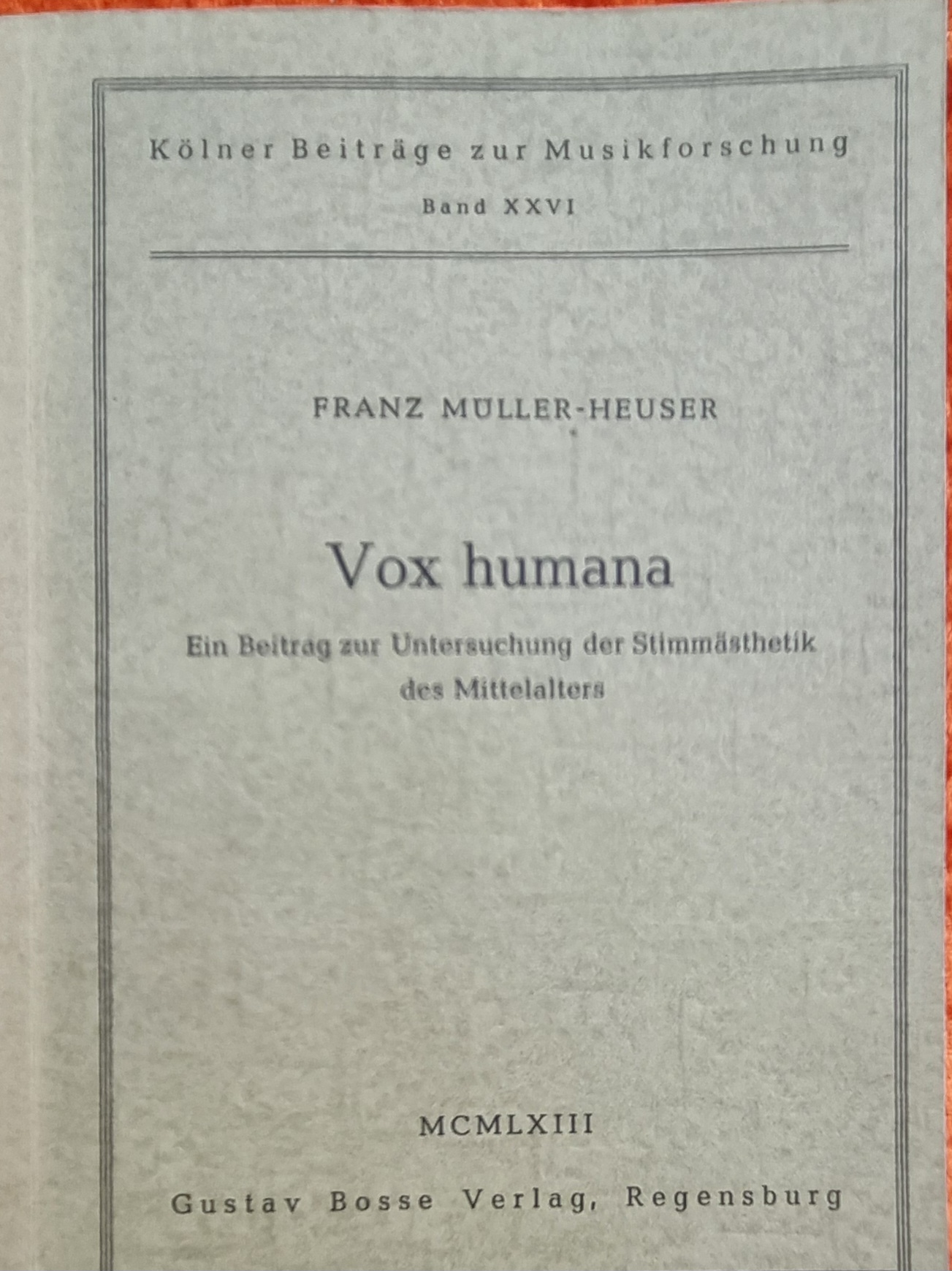 Müller-Heuser, Franz: Vox humana. Ein Beitrag zur Untersuchung der Stimmästhetik des Mittelalters. Regensburg, Gustav Bosse, 1943. Ca. 21 x 14,5 cm. 188 Seiten. Originalkartonierter Einband. Aus der Reihe: Kölner Beiträge zur Musikforschung, Band XXVLI. Gutes Exemplar.