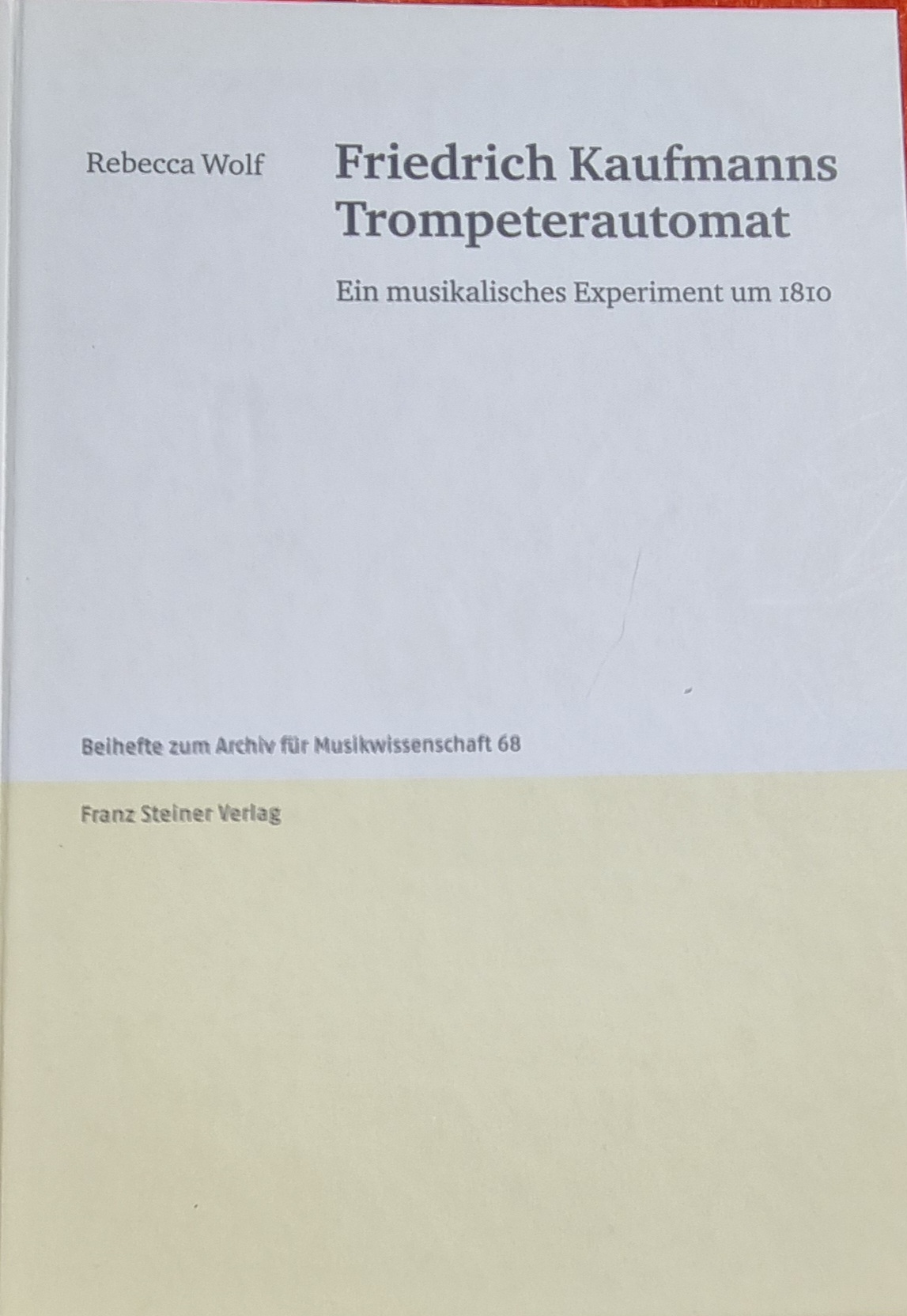 Wolf, Rebecca: Friedrich Kaufmanns Trompeterautomat. Ein musikalisches Experiment um 1810. Stuttgart, Franz Steiner Verlag, 2011. Ca. 24,5 x 17,5 cm. 242 S., (2) Seiten. Mit zahlreichen Abbildungen. Orig.-Pappband. Aus der Reihe: Beihefte zum Archiv für Musikwissenschaft, Band 68. Gutes Exemplar. „Dieser Musikandroid faszinierte das 19. Jahrhundert hindurch auf Konzertreisen ein breites Publikum …“.