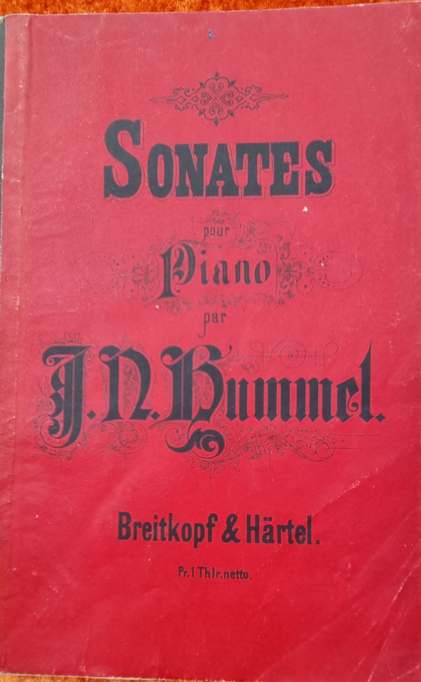 Hummel, J[ohann] N[epomuk]: Sonaten für das Pianoforte. Neue Ausgabe. Leipzig, Breitkopf & Härtel, [1870]. Ca. 26 x 17 cm. 103 Seiten Noten. Roter Orig.-Halbleinenband. Titelblatt mit Besitzstempel. Einband leicht bestoßen.