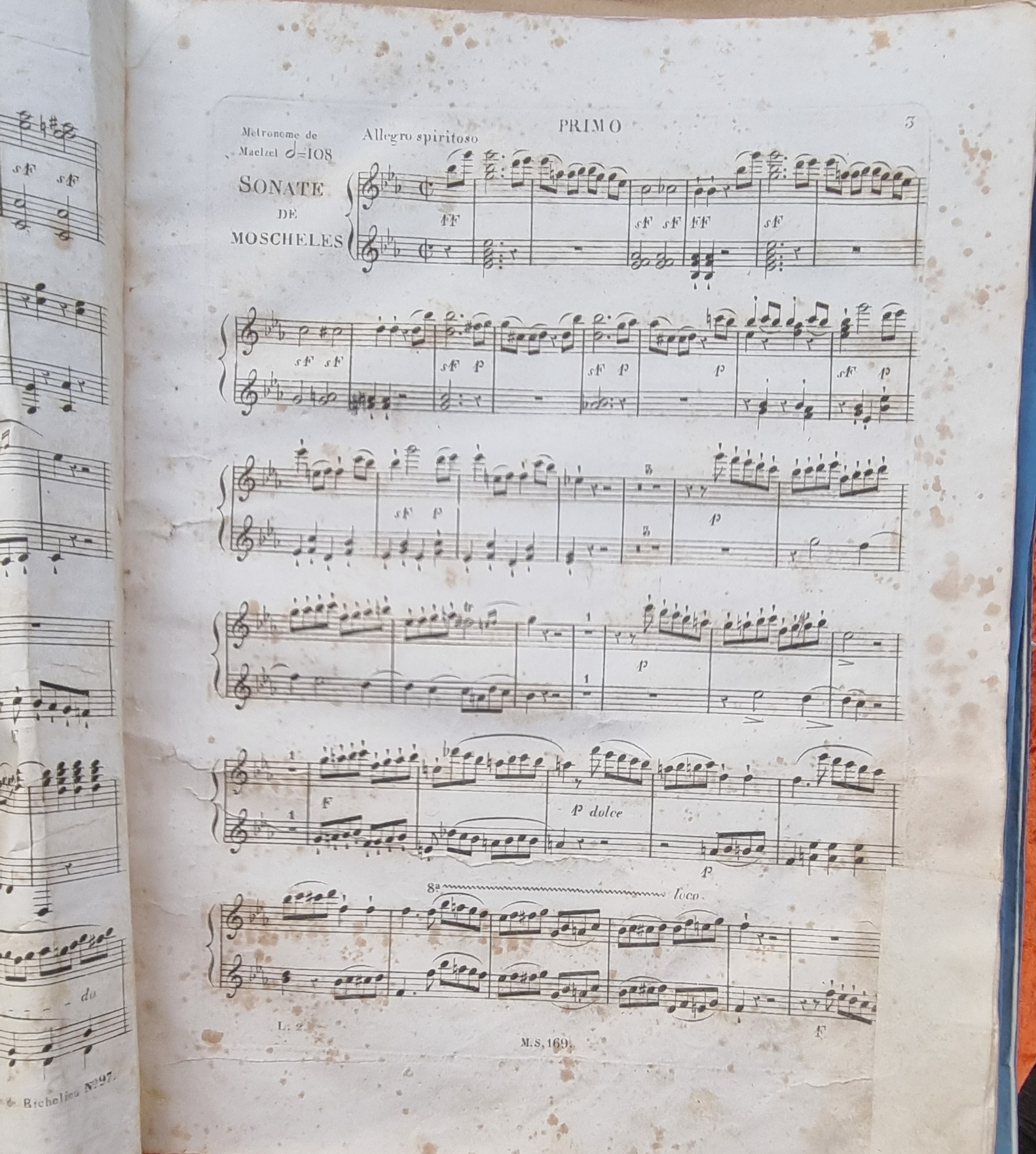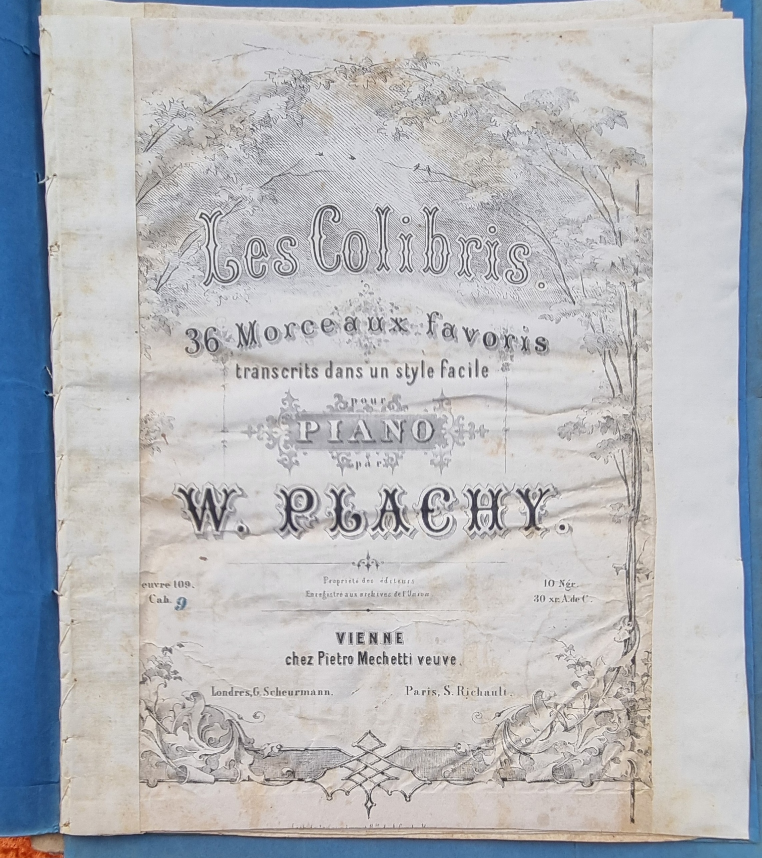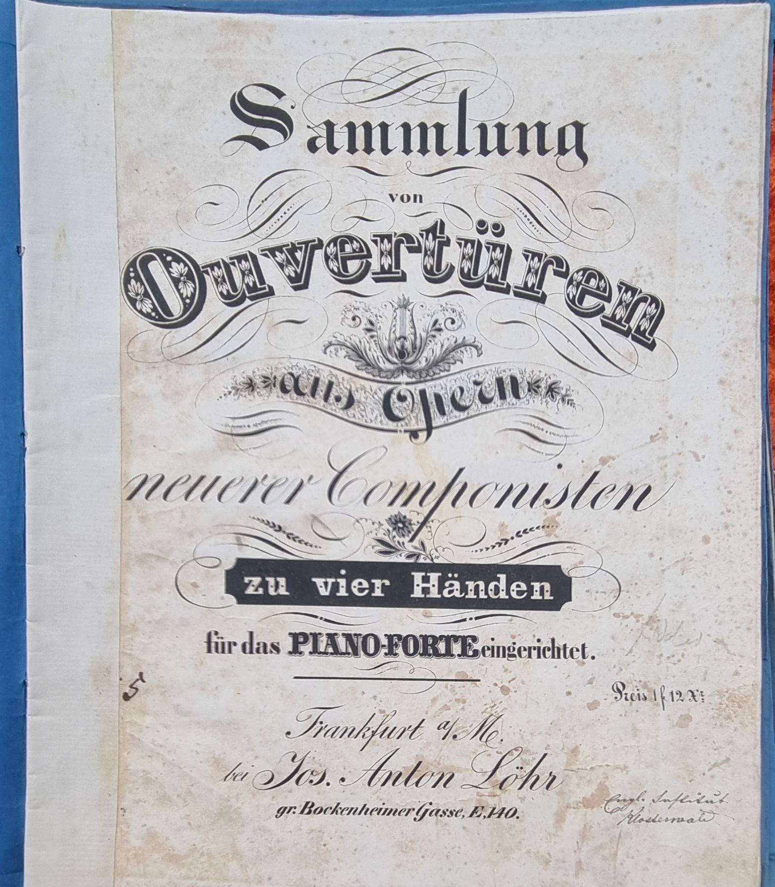 Konvolut von 30 Notenheften. Verschiedener Umfang. Größtenteils mit gestochenen Noten. Ca. aus den 1830er bis 1880er Jahren. ca. 1830-1880 Ca. 31,5 x 25,5 cm (auch einige kleinere Formate) Teils Papierumschlag, teils Pappeinbände oder Halbleinenbände. Teils etwas fleckig bzw. stockfleckig, teils mit kleineren Randeinrissen. Enthält u.a.: Hummel: Grand Septuor de Louis van Beethoven … pour le Pianoforte; Czerny: Variations Brillantes … Pianoforte, Le Serment Der Schwur oder die Falschmünzer; Diabelli: 12 Leichte Waltzer in G dur für das Pianoforte; Ries: sonatine pour le Pianoforte; Kalkbrenner: Variations Brillantes … pour le Pianoforte; Schletterer: Dreiundvierzig Kinderlieder von Hoffmann von Fallersleben; Czerny: 40 Tägliche Studien auf dem Piano-Forte; Czerny: Le trois soeurs. Rondinos pour le Piano à 6 mains; Haydn: Oeuvres Complettes – Cahier IV: VIII Pièces pour le Pianoforte; Czerny: La Rose; Bayer: An der Alster … für Zither und Pianoforte; Plachy: Les Colibris; Hummel: Etudes pour le Piano-Forte; Spohr: Ouverture de l’Opera Jessonda; Weigel: Theoretisch practische Zitherschule; Onslow: Toccata pour le Pianoforte; Chopin: Quatre Mazurkas pour le Pianoforte; Cramer: Fantasie sur des Motifs de l’opera Robert Le Diable … pour le Pianoforte; Mendelssohn-Bartholdy: Sechs Lieder ohne Worte für Pianoforte und Violine; Baumann: Der Zitherspieler; Hünten: Improvisation … Faust pour le Piano; Pacher: Melodienschatz für Pianoforte; Offenbach: Concert für Kinderinstrumente und Pianoforte aus der Operette Tschin-Tschin.
