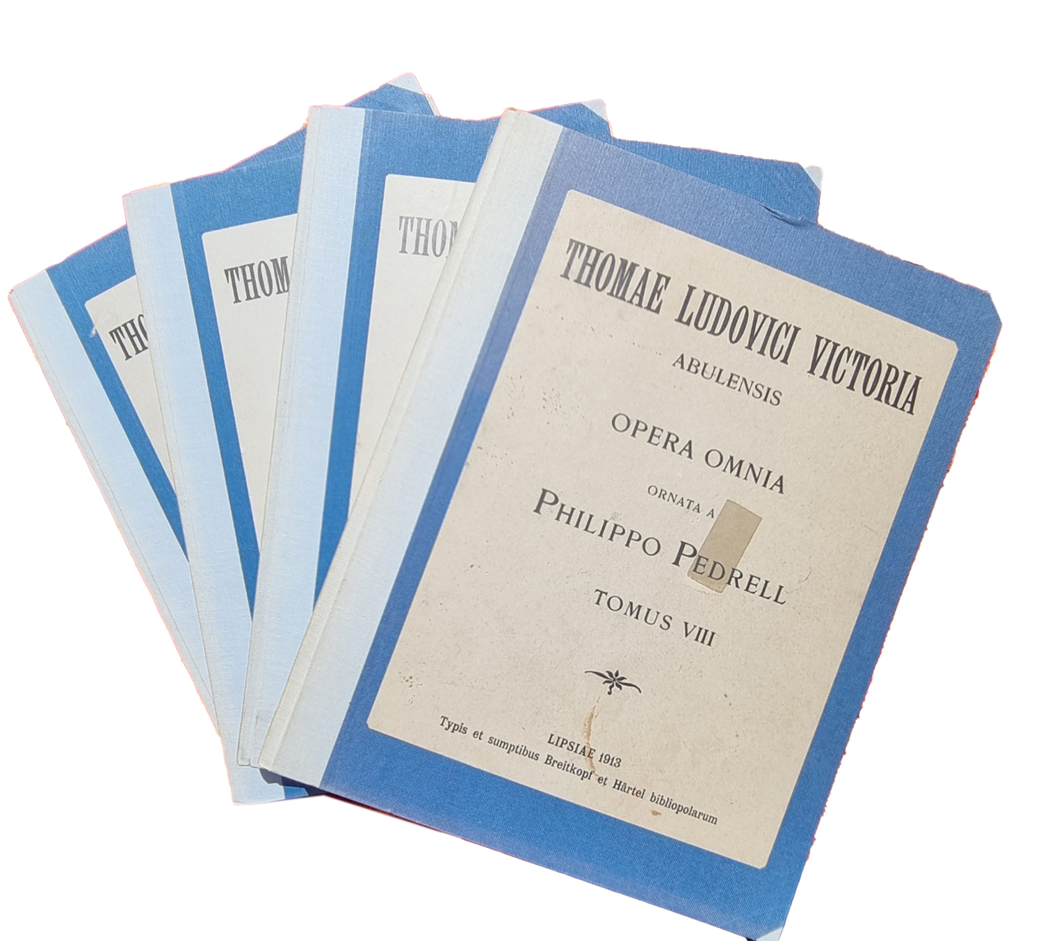 Victoria – Pedrel, Philipp (Hrsg.): Thomae Ludovici Victoria Abulensis. Opera omnia. Tomus V: Hymni totius anni et officium hebdomadae sanctae, 1908; Tom VI: Missarum liber tertius, 1909; Tom VII: Psalmi-antiphonae Marianae …, 1911; Tom. VIII: Documenta biographica et bibliographica …. 1913. 4 Bände. Leipzig, Breitkopf & Härtel, 1908-1913. Ca. 32,5 x 26 cm. 200 Seiten; 151 Seiten; 161 Seiten; XCVIII S., 57 Seiten. Halbleinenbände mit aufgezogener Deckelbroschur. Einbände minimal gebogen, jedoch gutes Exemplar. Tomás Luis de Victoria (* um 1548-1611, spanischer Komponist) war einer der bedeutendsten spanischen Komponisten der Renaissance und widmete sein Werk ausschließlich der geistlichen Musik. Tomus VIII enthält eine „Biographisch-Bibliographische Studie über den Meister von Avila Topmás Luis de Victoria und über die gegenwärtige vollständige Ausgabe seiner Werke“ in drei Sprachen (spanisch, deutsch, französisch).