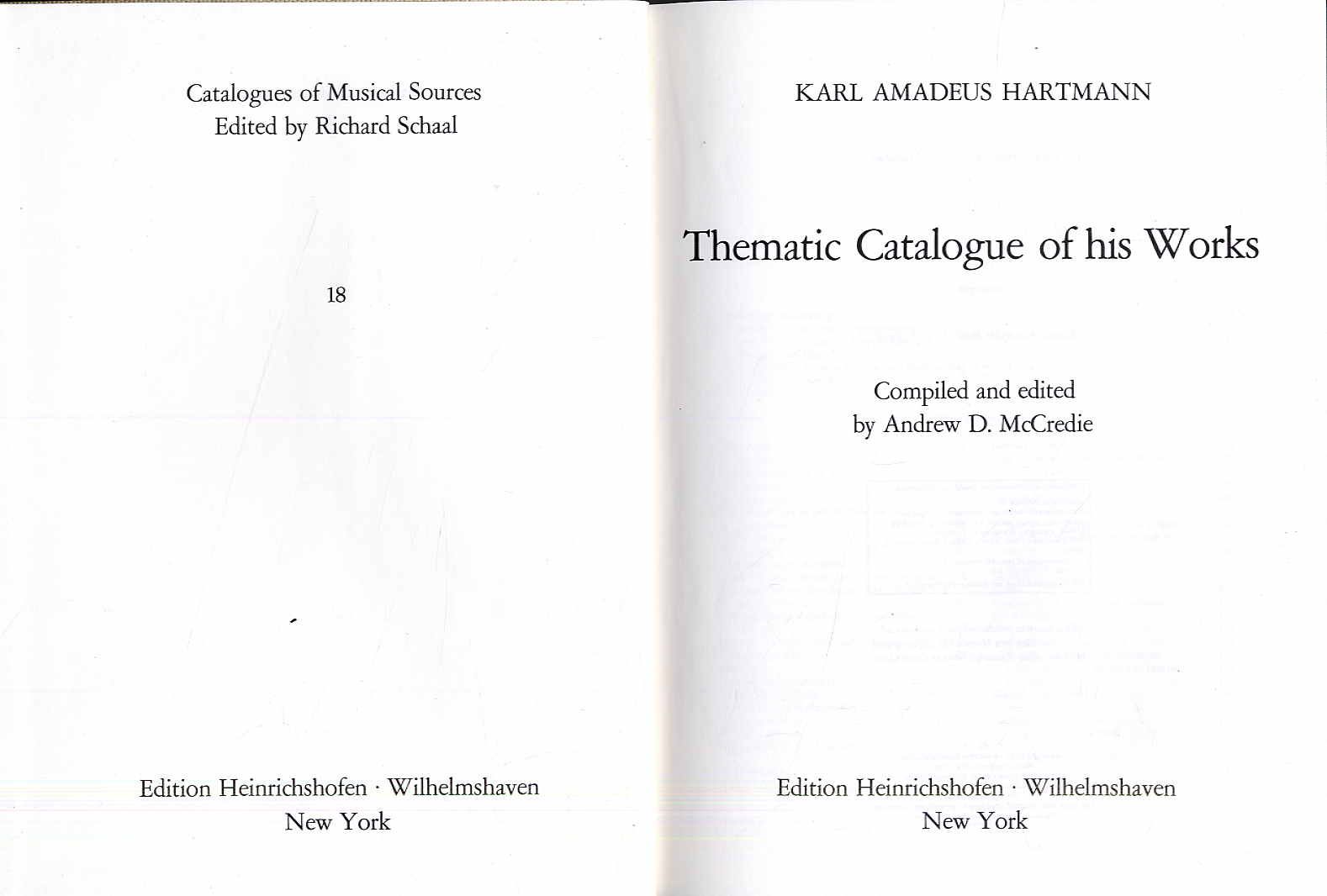 McCredie, Andrew D. (Hrsg.): Karl Amadeus Hartmann. Thematic catalogue of his works. Wilhelmshaven u. New York, Edition Heinrichshofen, 1982. Ca. 30 x 23 cm. 227 Seiten. Mit zahlreichen Notenbeispielen. Orig.-Leinenband. Aus der Reihe: Catalogues of Musical Sources, Band 18. Text auf Englisch. Karl Amadeus Hartmann (1905-1963, deutscher Komponist). Sehr gutes Exemplar.