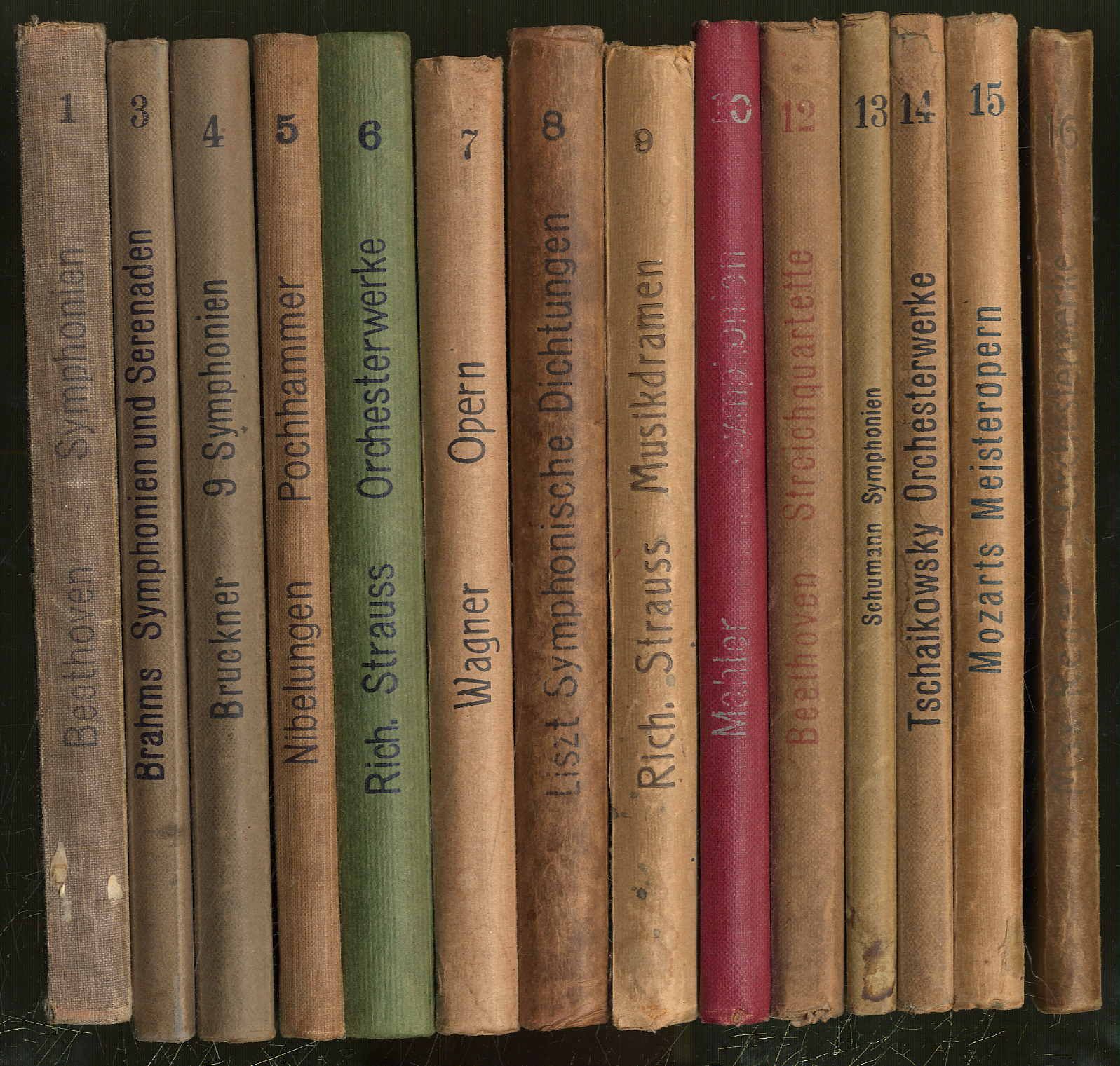 Schlesingersche Musik-Bibliothek – Konvolut. Vorhanden sind die „Meisterführer“, Bände: Nr. 1 Beethoven’s Symphonien; 3 Brahms Symphonien und andere Orchesterwerke; 4 Bruckner’s Symphonien; 5 Richard Wagner’s Der Ring des Nibelungen; 6 Richard Strauss Symphonien und Tondichtungen; 7 Richard Wagners Opern; 8 Liszt, Symphonische Dichtungen; 9 Richard Strauss Musikdramen, 10 Mahlers Symphonien; 12 Beethoven’s Streichquartette; 13 Rob. Schumann’s Symphonien; 14 Tschaikowsky’s Orchesterwerke; 15 Mozarts Meisteropern; 16 Max Reger Orchesterwerke. Berlin, Schlesinger’sche Buch- und Musikhandlung, 1910/1920er Jahre. Ca. 18,5 x 12,5 cm. Je Band zwischen 125 und 222 Seiten. Mit zahlreichen Notenbeispielen. Orig.-Leinenbände. Aus der Reihe: Schlesinger’sche Musik-Bibliothek. 14 Bände aus der Reihe. Einbände teils etwas berieben bzw. fleckig, einige Rücken bestoßen. Teils mit Stempel auf Titelblatt. Schnitt etwas fleckig. Erläutert mit Notenbeispielen und teils mit biographischen Einleitungen.
