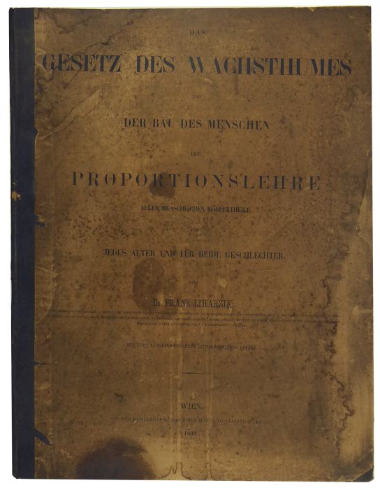 Liharzig, Franz: Das Gesetz des Wachsthumes und der Bau des Menschen. Die Proportionslehre aller menschlichen Körpertheile für jedes Alter und für beide Geschlechter. Wien, Hof- und Staatsdruckerei, 1862. Ca. 58 x 45 cm. 1 Blatt, 35 Seiten. Mit 8 Tabellen und 9 lithographierten Tafeln. Orig.-Halbleinenband. Erste Ausgabe des äußerst seltenen Werkes (über den worldcat nicht nachweisbar). Der Wiener Arzt Liharzik (1813-1866) war zunächst Assistent des Geburtshelfers Hussian und übernahm dann die Leitung des von Goelis gegründeten Kinderkrankenhaus; dort begann er mit den Messungen der einzelnen Körperteile, mit denen er seine Proportionslehre begründete. Hirsch-H. III, 785-86 ff. Einband stark fleckig, der Text stellenweise leicht gebräunt, ein hinterlegter Einriß, die Tafeln sauber.