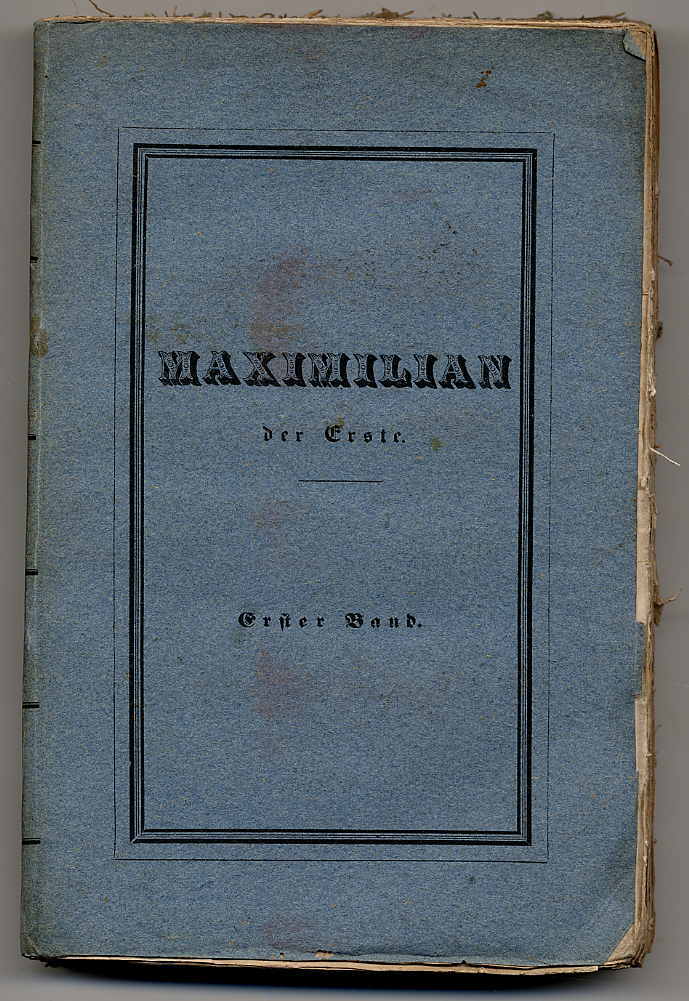Aretin, Karl Maria: Geschichte des bayerischen Herzogs und Kurfürsten Maximilian des Ersten. Erster Band (alles Erschienene). Passau, Pleuger (= Pustet), 1842. Ca. 15 x 22 cm. XVI S., 521 Seiten. Mit chromolithographiertem Frontispiz. Orig.-Broschur. Erste Ausgabe. Lentner 3770. Nicht bei Pfister. Das Frontispiz zeigt das Reiterstandbild Maximilians auf dem Wittelsbacherplatz. Papierbedingt wie immer etwas braunfleckig. Unbeschnitten
