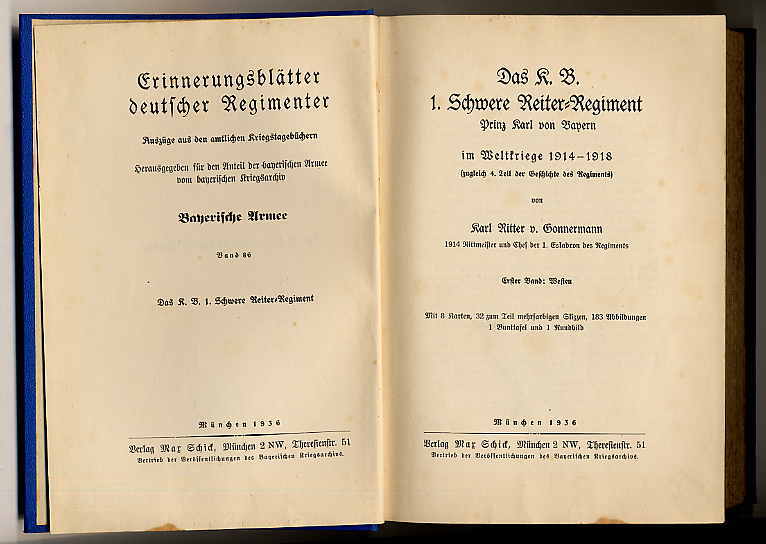 Gonnermann, Karl v.: Das K.B. 1. Schwere Reiter-Regiment Prinz Karl von Bayern im Weltkriege 1914-1918 (zugleich 4. Teil der Geschichte des Regiments). Erster Band: Westen. München, Max Schick, 1936. Ca. 25,5 x 18 cm. XXIII S., 464 Seiten. Mit 8 Karten, 32 zum Teil mehrfarbigen Skizzen, 183 Abbildungen, 1 Bunttafel und 1 Rundbild. Mit einem Blatt Druckfehlerberichtigung. Orig.-Leinenband. Aus der Reihe: Erinnerungsblätter deutscher Regimenter, Band 86. Seiten teils stockfleckig (Vorsätze stärker).