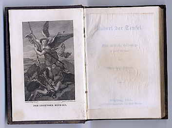 Strauß, Victor v.: Robert der Teufel. Eine christliche Heldensage in zwölf Gesängen. Heidelberg, Karl Winter, 1854. Ca. 13,5 x 9 cm. (10) S., 384 Seiten. Mit Stahlstichfrontispiz. Orig.-Leinenband mit reicher Goldprägung. Mit Goldschnitt. Einband stärker fleckig. Vorsätze leicht fleckig. Das Frontispiz zeigt den Erzengel Michael.