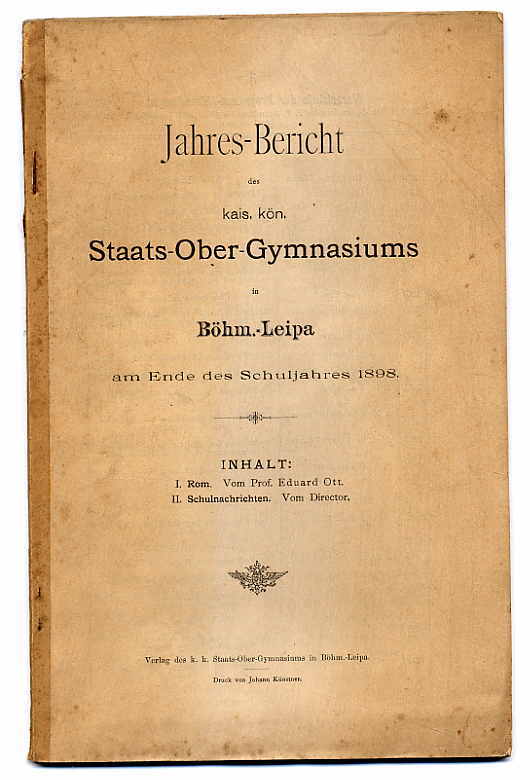 Schulprogramm – Jahres-Bericht des kais. kön. Staats-Ober-Gymnasiums in Böhm.-Leipa am Ende des Schuljahres 1898. Böhm.-Leipa, Verlag des k.k. Staats-Ober-Gymnasiums. Ca. 26 x 17 cm. 96 Seiten. Geklammerte Seiten am Rücken mit Papierstreifen verbunden. Inhalt: Eduard Ott: Rom (4. März bis 10. April 1896); Schulnachrichten. Etwas gebräunt und angestaubt.