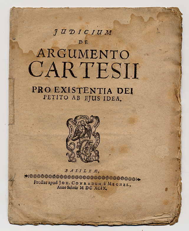 [Werenfels, Samuel]: Judicium de argumento Cartesii pro existentia Dei petito ab ejus idea. Basel, Joh. conrad Mechel, 1699. Ca. 21 x 16,5 cm. 18 Seiten. Fadengeheftete Seiten. Erste Ausgabe. VD17 7:719353M. Abhandlung des Schweizer reformierten Theologen Samuel Werenfels (1657-1740) mit der Kritik an Descartes Gottesbeweis. Unbeschnittenes Exemplar, angerändert. Durchgehend wasserfleckig. Text in Latein.