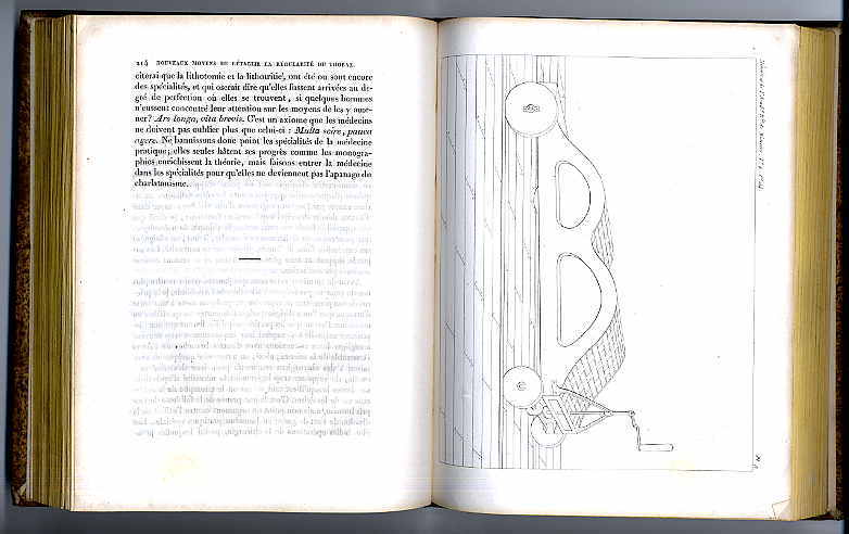 Memoires de l’Académie royale de Médecine. Tome quatrième. Paris, J.B. Baillière, 1835. Ca. 26 x 20 cm. 92 S., 496 Seiten. Mit 9 lithographierten Tafeln. Halblederband der Zeit mit Rückengoldprägung. U.a.: Pariset: Compte rendu dues travaux de l’academie pendant l’année 1833; G. Mirault: Mémoire sur la ligature de la langue et sur celle de l’artère linguale en particulier (1 Tafel); E.–.A. Lauth de Strasbourg: Remarques sur la structure du larynx et de la trachée-artère (1 Tafel); A-C. Reynaud: Mémoire sur l’oblitération des Bronches (5 Tafeln); J.-N. Roux: Observations d’imperforation de l’anus et de l’urètre (1 Tafel); Pravaz: Note sur de nouveaux moyens de rétablie la régulabité du thorax dans le cas d déviation latérale du rachis (1 Tafel); Nummernaufkleber auf Vorderdeckel. Stempelabdruck auf Titelblatt und letzter Seite. Rücken und Kanten bestoßen. Innen leicht stockfleckig. Text in französisch.