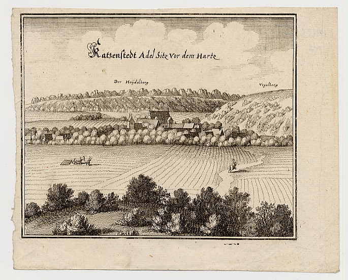 Cattenstedt – Blankenburg – Katzenstedt Adel Sitz vor dem Hartz. Kupferstich von Merian. Um 1654. Ca. 14 x 17 cm. Dekorative Ansicht von Katzenstedt (Cattenstedt), im Hintergrund die Anhöhen Vogelberg und Heidelberg. Im Vordergrund Reiter sowie Bauer mit Pferd und Egge.