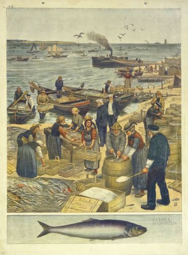 Im unteren Bildteil ist ein prächtiger Hering mit 37 cm Länge zu sehen. Darüber eine Hafenszene, sie zeigt die Verarbeitung des Herings, Verkäufer, Seeleute, Fischer, Heringsfässer, Körbe mit Fischen, Fischerboote. Am Boden große Mengen toter Heringe und eine Kiste mit Salz. Im Bildhintergrund Segelschiffe, ein kleines Dampfschiff und aufgehängte Fischernetze. Mit Knitterfalten und berieben, jedoch sehr dekoratives Schulwandbild.