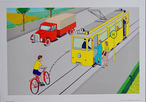 Verkehr – Hagemanns Verkehrsbildermappe für die Grösseren. Mappe II. 16 farbige Bilder zum Verkehrsunterricht für Radfahrer. Düsseldorf, Wilhelm Hagemann, ca. 1955. Querformat, caa. 43 x 60 cm. 15 (von 16) lose farbiige Tafeln im Original-Umschlag. Originalkartonierter Umschlag. Klaus und Grete fahren im Stadtverkehr (Bilder 1-9 – ohne Bild 5); Klaus und Grete machen einen Ausflug (Bilder 10-16). Die Bilderzeigen die fahrradfahrenden Jugendlichen Klaus und Grete im Straßenverkehr mit Motorrad, Autos, Pferdefuhrwerken, Straßenbahn, am Zebrastreifen, im Kreisverkehr, in Dunkelheit am Bahnübergang, ein Blatt zeigt die „Unarten auf dem Fahrrad“. Es fehlt das Blatt „Klaus und Grete vor der Verkehrsampel“. Umschlag (dieser fleckig und an den Kanten bestoßen) und Blattrückseiten mit handschriftlicher Nummer. Ein Blatt an den weißen Ecken mit Klebestreifenresten. Sehr dekorative Blätter in kräftigen Farben. – Versand außerhalb Deutschlands nur auf Anfrage.