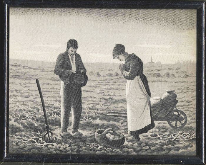 Seidenbild – Religion – Seidenbild – L’Angelus. – Angelusläuten. Ca. 1910. Querformat, ca. 18,5 x 14,5 cm. Gerahmt, hinter Glas. Gewebtes Seidenbild nach einem Gemälde von Jean-Francois Millet (1814-1875). Aus der Seidenmanufaktur Neyret Freres, einer 1823 in St. Étienne gegründete französische Textilfabrik. Das Bild stellt einen Bauer und eine Bäuerin dar, die sich in einem Feld über einen Korb mit Kartoffeln beugen um zu beten. Im Hintergrund des Bildes ist der Turm der Kirche von Chailly-en-Bière zu erkennen. Im Vordergrund eine Karre mit Kartoffelsäcke und eine Gabel. Schriftenreihe Obere Mühle: Ausstellung vom Seidenen Faden zum gewebten Kunstbild“ als „Gebet“ bezeichnet.