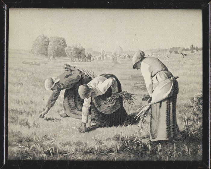 Seidenbild – Seidenbild – Les glaneuses. Ca. 1910. Querformat, ca. 18,5 x 14,5 cm. Gerahmt, hinter Glas. Gewebtes Seidenbild nach einem Gemälde von Jean-Francois Millet (1814-1875). Aus der Seidenmanufaktur Neyret Freres, einer 1823 in St. Étienne gegründete französische Textilfabrik. Das Bild zeigt drei Landarbeiterinnen bei der Nachsuche auf einem abgeernteten Getreidefeld, im Hintergrund Arbeiter und Wagen. Schriftenreihe Obere Mühle: Ausstellung vom Seidenen Faden zum gewebten Kunstbild“ als Ernte“ bezeichnet.