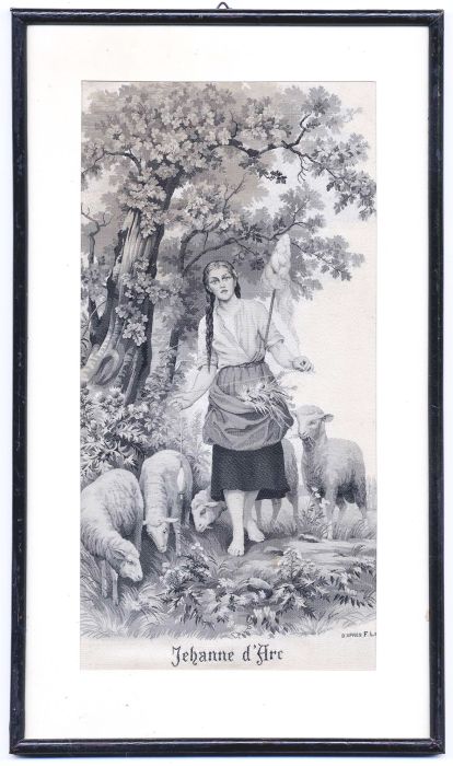 Seidenbild – Seidenbild – Jehanne d’Arc écoutant les voix. Um 1910. Ca. 30 x 15 cm. Unter Passepartout, gerahmt, hinter Glas. Gewebtes Seidenbild nach einem Gemälde von Fernand Lematte (1850-1929), mit gewebter Signatur und gewebtem Titel „Jehanne d’Arc“. Jeanne D’Arc trägt eine Wollspindel und hütet Schafe. Aus der Seidenmanufaktur Neyret Freres, einer 1823 in St. Étienne gegründeten französischen Textilfabrik.