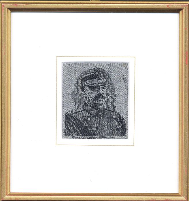 Seidenbild – Porträts – Wille – Seidenbild – General Ulrich Wille 1914. Ca. 7 x 6 cm. Unter Passepartout, gerahmt, hinter Glas. Gewebtes Seidenbild mit gewebtem Titel „General Ulrich Wille 1914“. Wille (1848-1925, General der Schweizer Armee). Schriftzug etwas ungelenk gewebt.