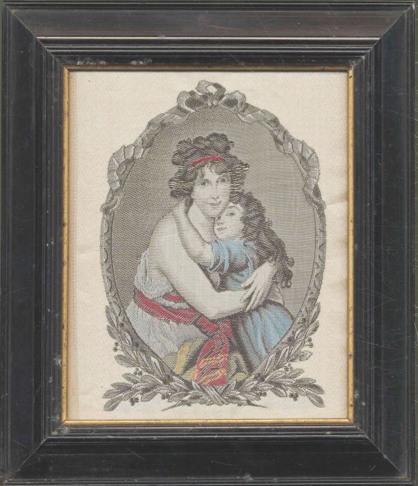 Seidenbild – Seidenbild – Mutter und Tochter. Um 1900. Ca. 17 x 13,5 cm. Gerahmt, hinter Glas. Farbig gewebtes Seidenbild. Eine junge Frau umarmt ihre kleine Tochter, umrahmt von einem gewebten Bilderrahmen. Das Kleid des Kindes, sowie die Schärpe und das Haarband der Frau sind farbig gewebt.