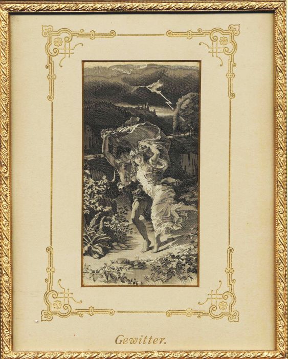 Seidenbild – Seidenbild – L’Orage. – Gewitter. Um 1910 Ca. 17,5 x 9,5 cm. Unter bedrucktem Original-Passepartout, gerahmt, hinter Glas. Gewebtes Seidenbild nach einem Gemälde von Pierre Auguste Cot (1837-1883). Ein junges Paar flieht vor einem Unwetter, im Hintergrund ein Blitz. Aus der Seidenmanufaktur Neyret Freres, einer 1823 in St. Étienne gegründeten französischen Textilfabrik. Schriftenreihe Obere Mühle: „Ausstellung vom Seidenen Faden zum gewebten Kunstbild“, hier als „Gewitter“ bezeichnet. Das Bild im goldgeprägten und mit „Gewitter“ bezeichneten Original-Pasepartout.