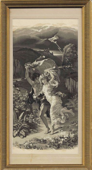 Seidenbild – Seidenbild – L’Orage. – Gewitter. Um 1910 Ca. 32 x 17,5 cm. Unter Passepartout, gerahmt, hinter Glas. Gewebtes Seidenbild nach einem Gemälde von Pierre Auguste Cot (1837-1883). Ein junges Paar flieht vor einem Unwetter, im Hintergrund ein Blitz. Aus der Seidenmanufaktur Neyret Freres, einer 1823 in St. Étienne gegründeten französischen Textilfabrik. Schriftenreihe Obere Mühle: „Ausstellung vom Seidenen Faden zum gewebten Kunstbild“, hier als „Gewitter“ bezeichnet.