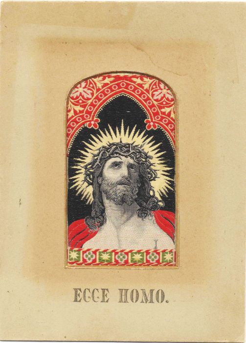 Seidenbild – Religion – Seidenbild – Ecce Homo. Ca. 10,5 x 6 cm. Im Original-Passepartout, dieses mit dem Titel bedruckt. Farbig gewebtes Seidenbild aus der Seidenmanufaktur Thomas Stevens, Coventry. Original-Stevengraph. Mit dem Original-Firmenetikett auf der Rückseite, Label 29+38 nach Godden. G. A. Godden: Stevengraphs and other Victorian silk pictures, § 101; Sprake: The price guide to Stevengraphs, STG85. Passepartout gebräunt und leicht fleckig. Bild farbfrisch.