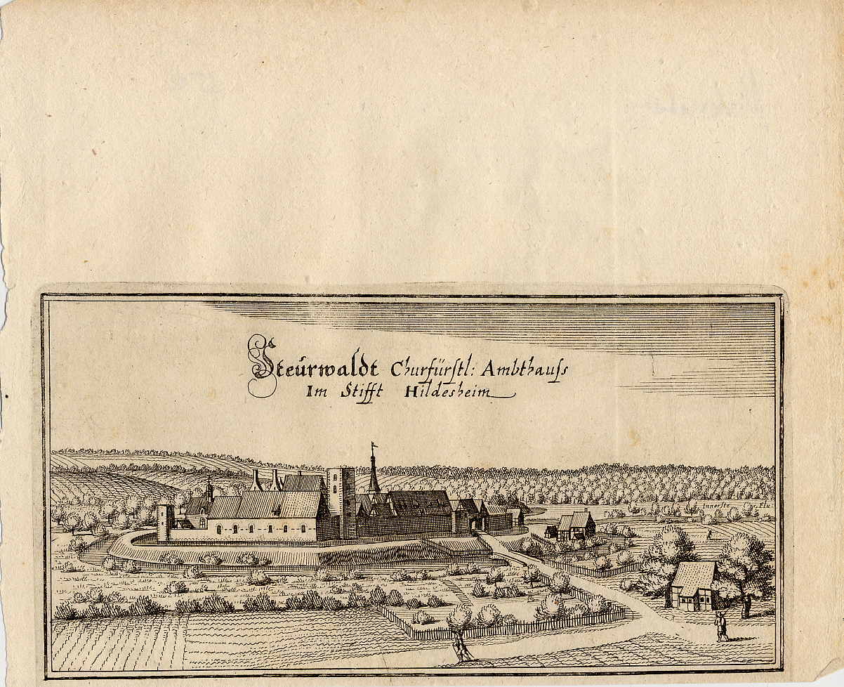 Hildesheim Steurwaldt. Churfürstl. Ambthauß im Stifft Hildesheim. Ca. 10 x 18 cm. Kupferstich von Matthäus Merian aus der „Topographia Braunschweig“ (1654). Blattgr.: Ca. 16 x 20 cm.