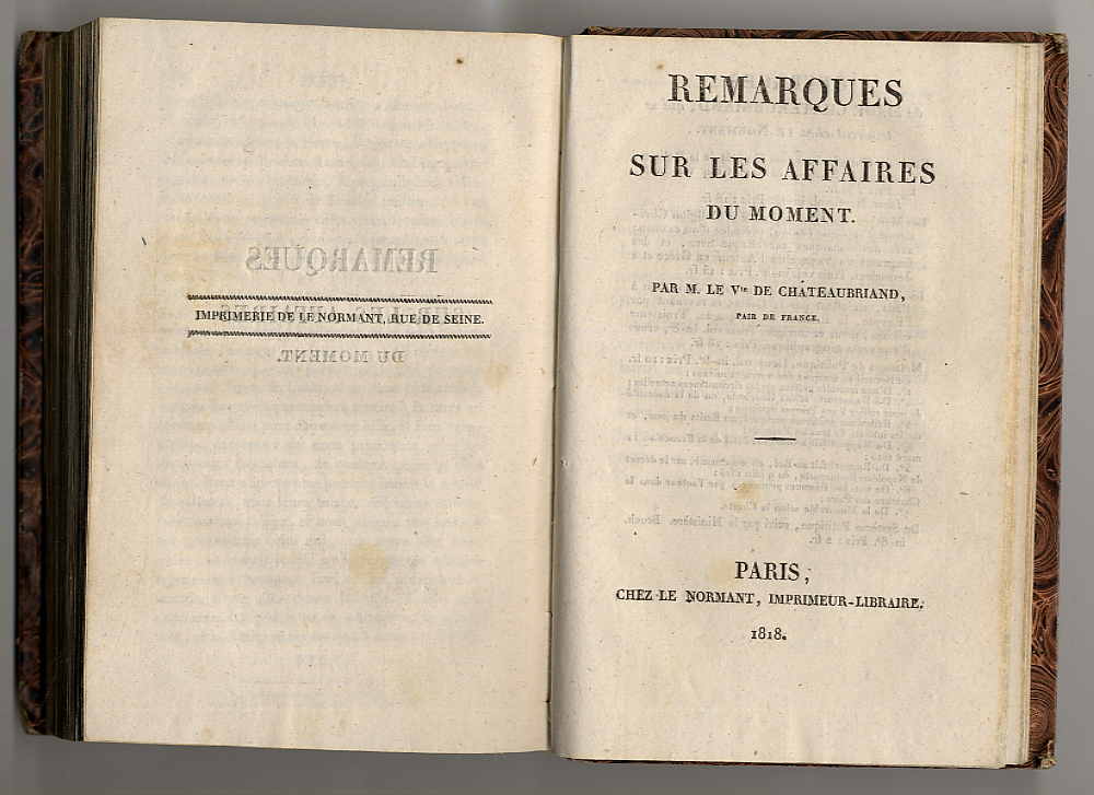 Chateaubriant, F(rancois-René) de: Essai historique, politique et moral sur les révolutions anciennes et modernes. London, Henri Colburn, 1820. Ca. 18,5 x 13 cm. VII S., 388 Seiten. Pappband der Zeit mit Bibliotheksrückenschild (ohne Beschriftung). Beigebunden: Chateaubriant: Remarques su les affaires du moment. Paris, 1818. 36 Seiten. Einige Stempel und handschriftliche Nummern auf Vorsatz und Titelblatt. Einband leicht berieben. Seiten anfangs minimal fleckig. In französischer Sprache.