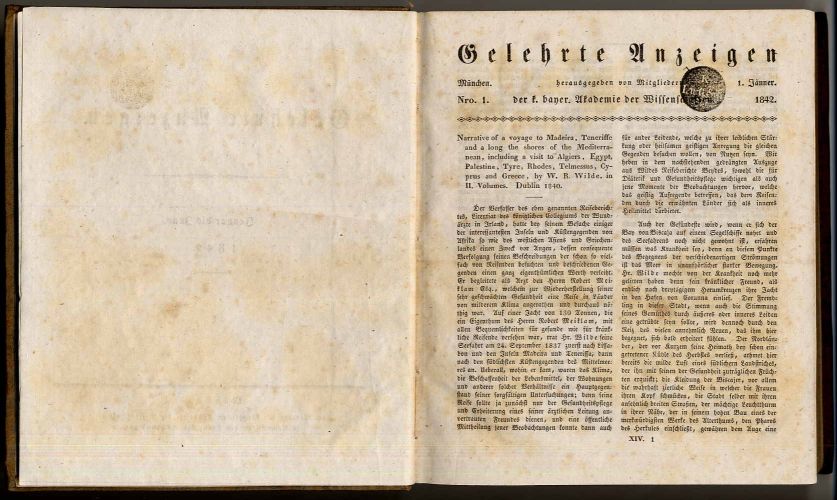 Gelehrte Anzeigen. Herausgegeben von Mitgliedern der k. bayer. Akademie der Wissenschaften. 14. Band, Januar bis Juny 1842. München, Verlage der königlichen Akademie der Wissenschaften. Ca. 25 x 21,5 cm. 1.040 Spalten. Pappband der Zeit mit handgeschriebenem Rückentitel. „Die Gelehrten Anzeigen, veröffentlicht von 1835 bis 1860, vereinigen verschiedene Publikationsformate der Akademie, die von Informationen über die gehaltenen Sitzungen über verschriftlichte Vorträge bis hin zu umfangreichen Buchbesprechungen und selbständigen Aufsätzen reichen. Sie wurden gesammelt in Jahresbänden veröffentlicht. Von 1843 bis 1853 tragen sie den alternativen Namen Bulletins der Akademie. Sie wurden 1860 von den Sitzungsberichten abgelöst. ″ (aus: Bayer. Akademie der Wissenschaften: Veröffentlichungen der Gelehrengemeinschaft). Ausgeschiedenes Exemplar einer aufgelösten Bibliothek, mit Exlibris und Stempel auf Titelblatt. Einige Seiten braunfleckig. Enthält u.a. Aufsätze und Buchbesprechungen zu: Narrative of a voyage to Madeira, Teneriffa and a long the shores of the Mediterranean … (deutsche Besprechung); Koch-Sternfeld: Historische Erinnerungen auf einer Reise durch Oesterreich; Schomburgk’s Reisen in Guiana und am Orinoko; Ueber den Ursprung der homerischen Gesänge; Ennemoser: ueber die Würde und den Standpunkt des Magnetismus in unserer Zeit; Agassiz: Untersuchungen über die Gletscher u.v.a.