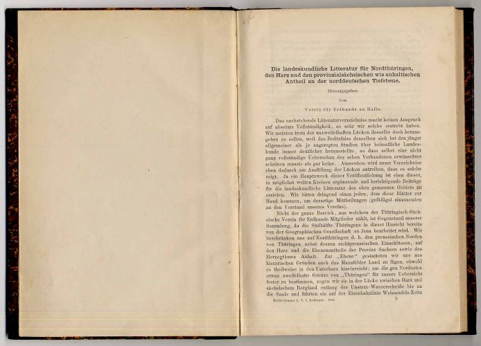 Verein für Erdkunde zu Halle (Hrsg.): Die landeskundliche Litteratur für Nordhtüringen, den Harz und den provinzialsächsischen wie anhaltischen Theil an der norddeutschen Tiefebene. Halle, Tausch & Grosse, 1890 Ca. 23 x 16 cm. Halbleinenband der Zeit mit aufgezogenem Originaldeckel. Aus den „Mittheilungen des Vereins für Erdkunde zu Halle“, Band 14 1890, Seiten 65-238. Etwas stockfleckig, einige Rotstiftanstreichungen. Ohne gesondertes Titelblatt. Wesentliche Bibliographie.